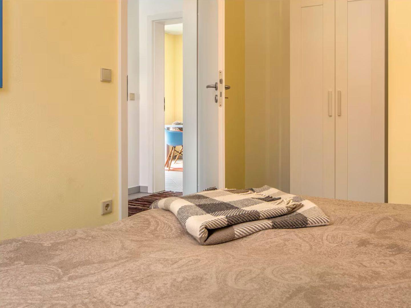 Das Schlafzimmer ist mit Fliesenboden gestaltet und bietet Platz für zwei Personen. Hochwertige Bettwaren und allergikerfreundliche Ausstattung sorgen für erholsame Nächte. Für Ihren Komfort stehen Ihnen außerdem ein Haartrockner, Spiegel und ausreichend Stauraum zur Verfügung. Das Badezimmer verfügt über eine Dusche, Waschbecken und WC. Hier profitieren Sie von einer Fußbodenheizung und warmem Wasser.