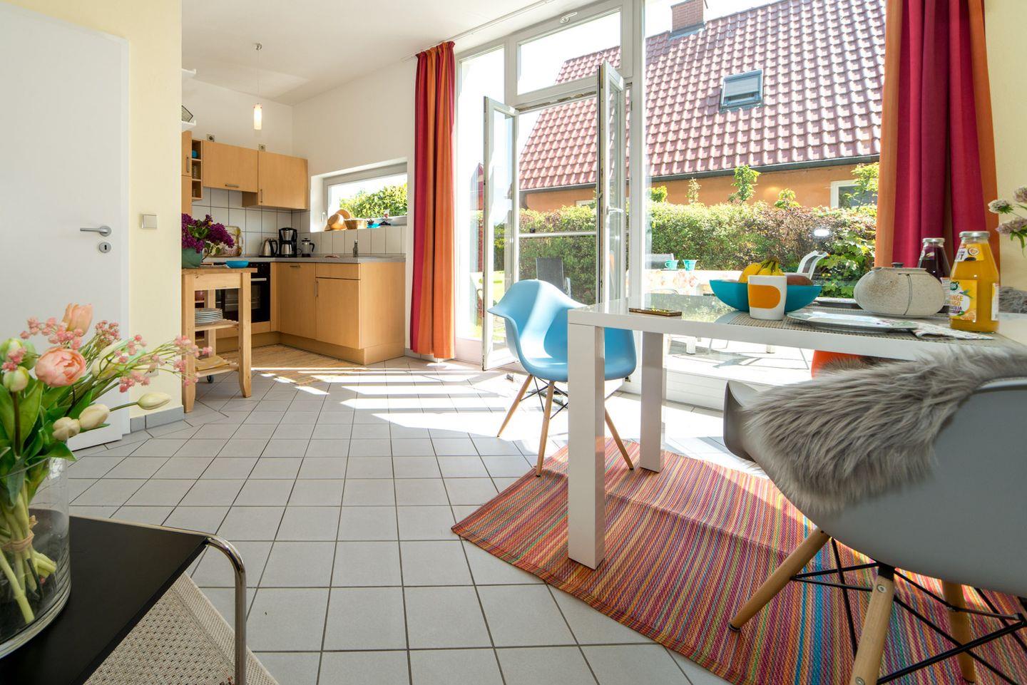 Das Herzstück der Unterkunft bildet der offen zum Wohnzimmer gestaltete Küchenbereich. Hier sind moderne Annehmlichkeiten wie ein Ceranherd, Backofen (elektrisch), Kühlschrank, Spülmaschine, Kaffeemaschine, Wasserkocher, Toaster sowie ausreichend Küchenutensilien, Geschirr und Besteck vorhanden. Ein Essbereich mit Esstisch lädt zu gemeinsamen Mahlzeiten ein. Die einladende Wohnatmosphäre wird durch das Sofa, Sessel und dekorative Details wie Bücher und Radio ergänzt.
