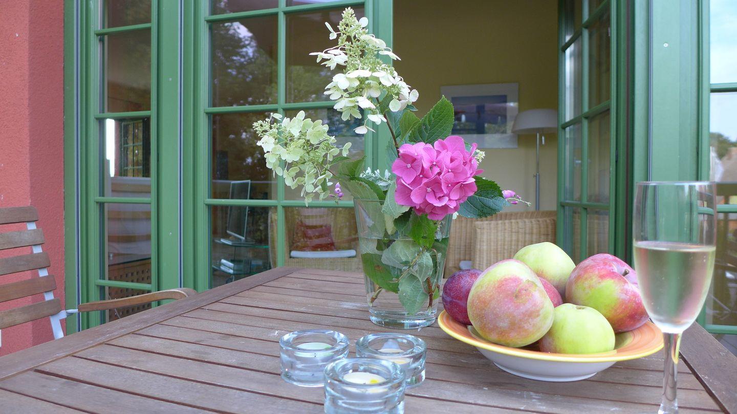 Obwohl Sie im Obergeschoss wohnen, müssen Sie auf das Gartenfeeling nicht verzichten. Im gepflegten Außenbereich steht den Gästen eine eigene Grillecke zur Verfügung. Ihr Fahrzeug parken Sie sicher auf dem zugehörigen PKW-Stellplatz. Für mitgebrachte oder gemietete Fahrräder bietet das Fahrradhaus am Grundstück sicheren Schutz.