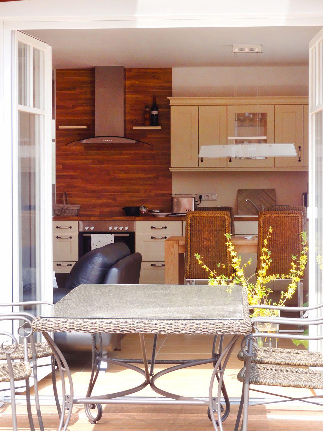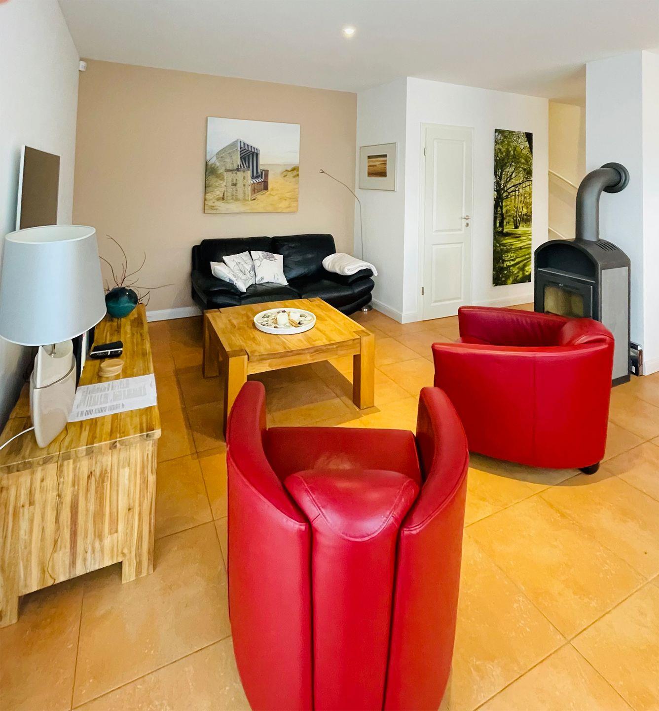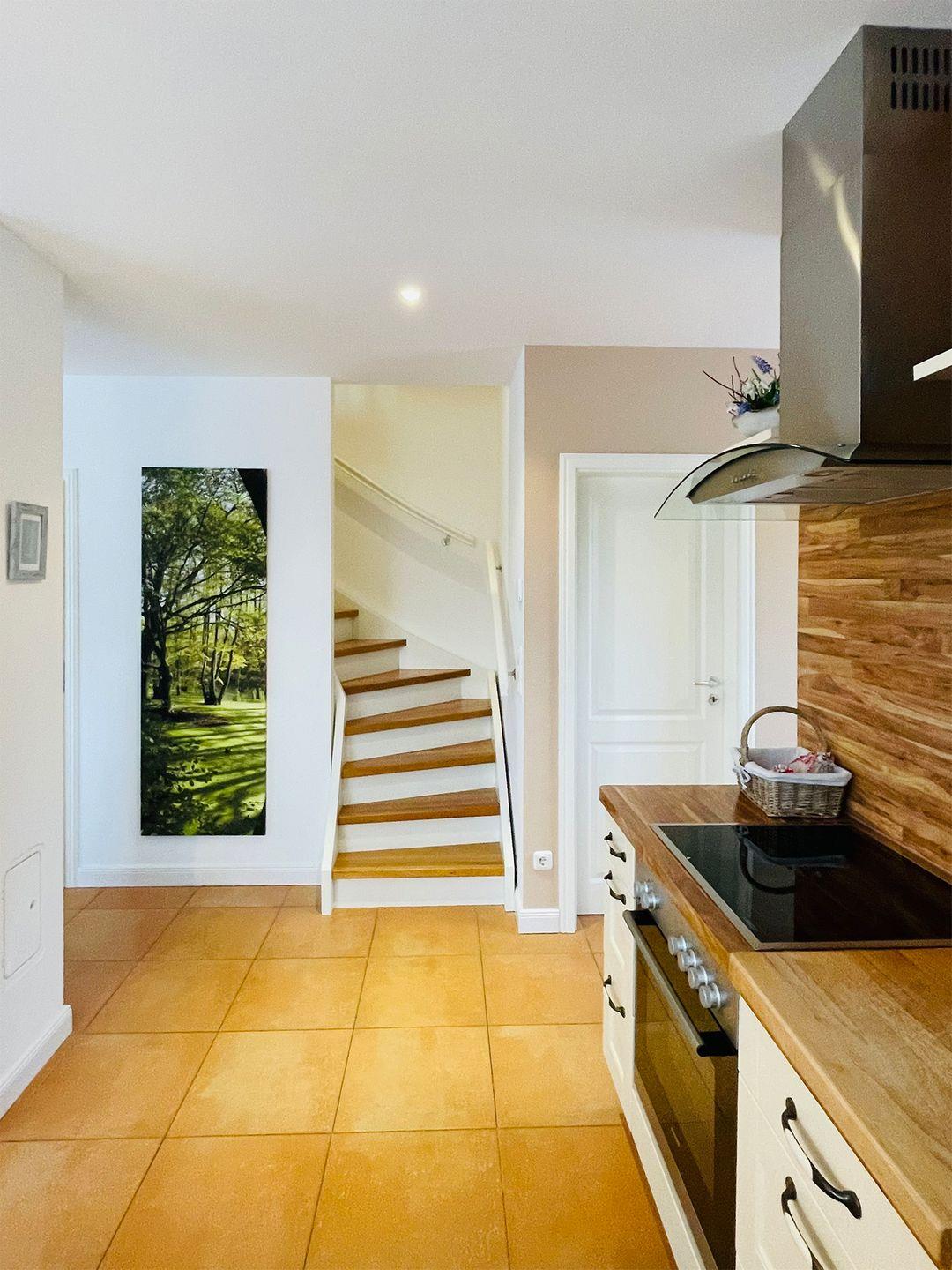 Im Erdgeschoss befindet sich der großzügige Wohn-/Essbereich mit einem Esstisch, einer bequemen Couchgarnitur, einem Kaminofen und einem Radio/CD-Player sowie SAT-TV für gemütliche Abende. Die offene Landhausküche ist bestens ausgestattet mit einem Backofen, Geschirrspüler, Cerankochfeld, Kaffeemaschine, Kühlschrank mit Gefrierfach, Toaster und Wasserkocher.