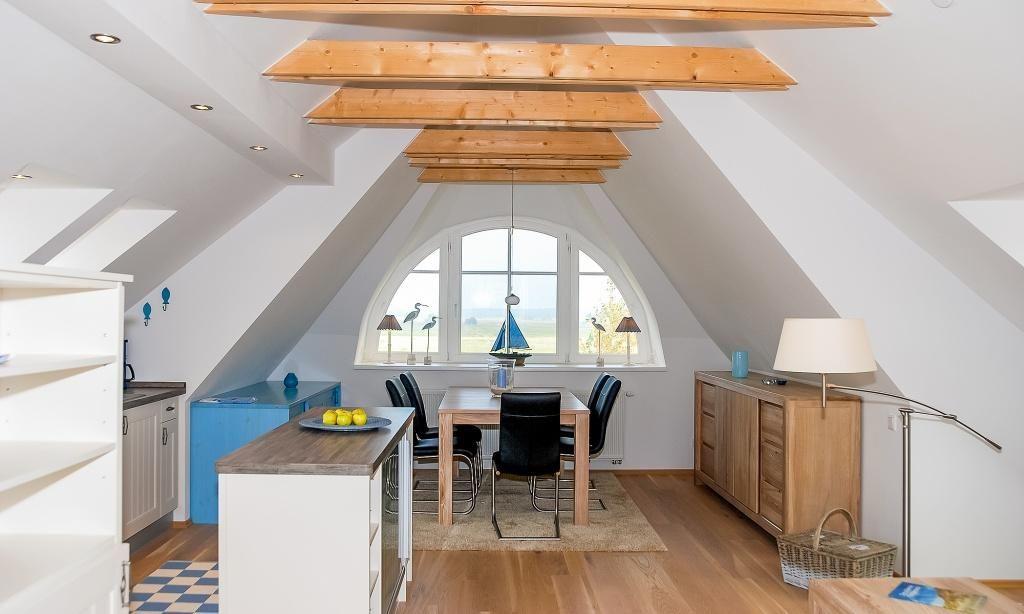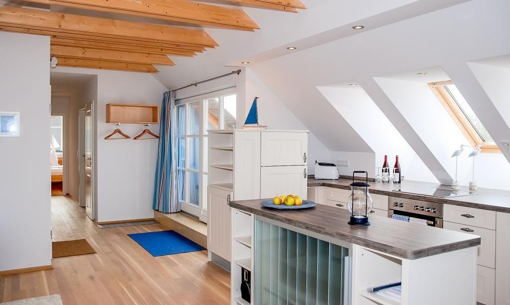 Die Dachgeschosswohnung empfängt dich mit einem offen und freundlich gestalteten Wohnraum, in dem eine gemütliche Sitzecke und ein großzügiger Essbereich integriert ist. Die hochwertige Einbauküche ist funktional ausgestattet und lässt keine Wünsche offen. Weiterhin gibt es zwei Schlafzimmer, eines verfügt über ein Doppelbett, das zweite über zwei Einzelbetten. Das Bad mit Dusche/WC sowie ein separates Gäste-WC machen den Wohnkomfort perfekt. Ein großer Süd-West Balkon, auf dem du entspannte Stunden nach einem ereignisreichen Tag verleben kannst, rundet das Gesamtpaket ab.