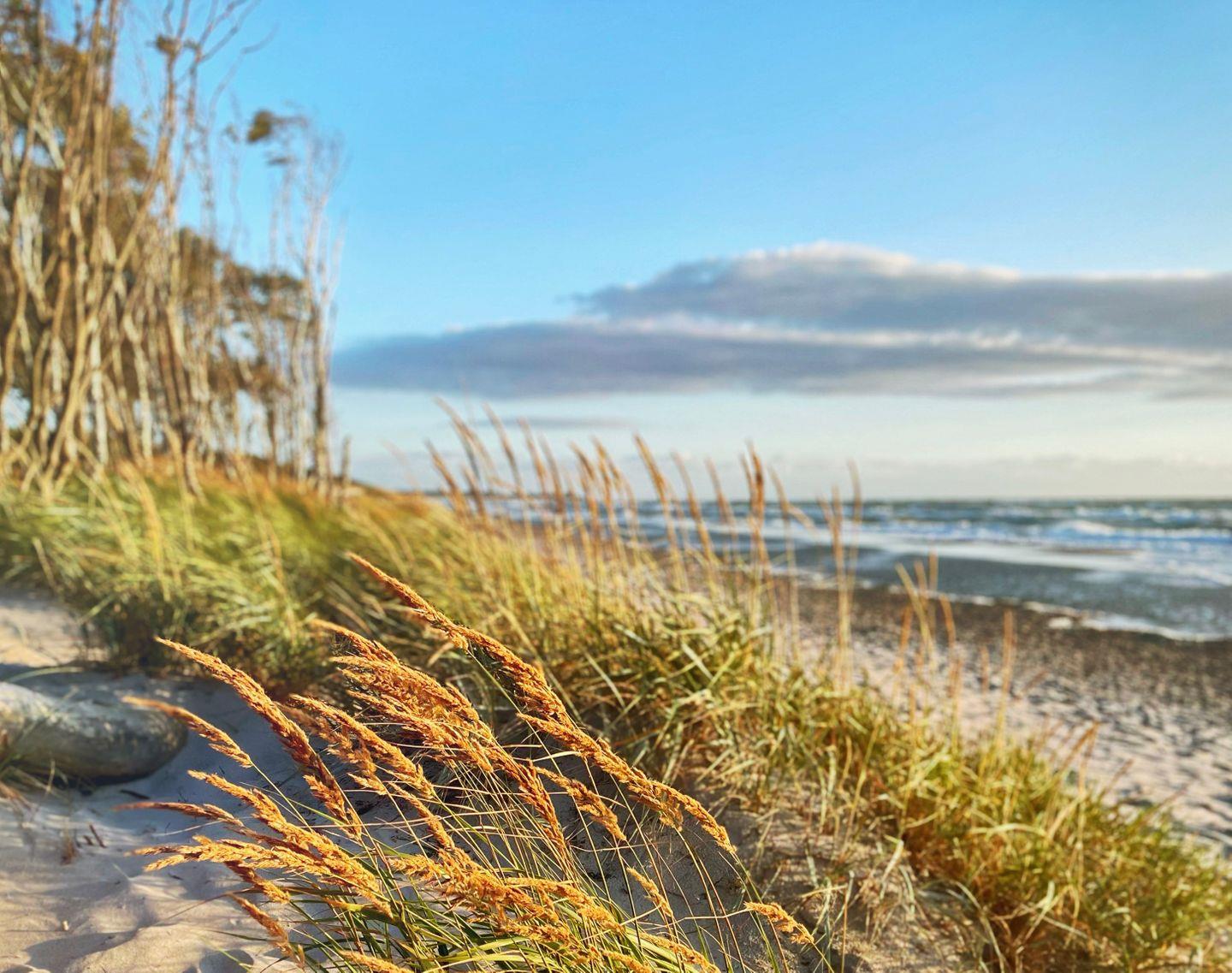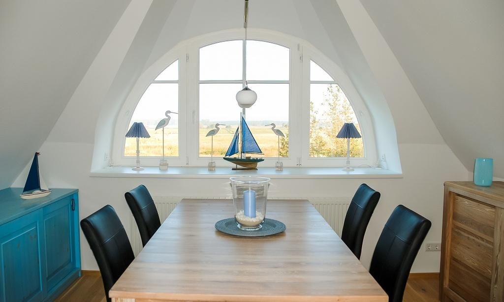 Komfortable Ferienwohnung in Wieck am Darß mit Sauna, Balkon und idyllischem Ausblick auf Wiesen.