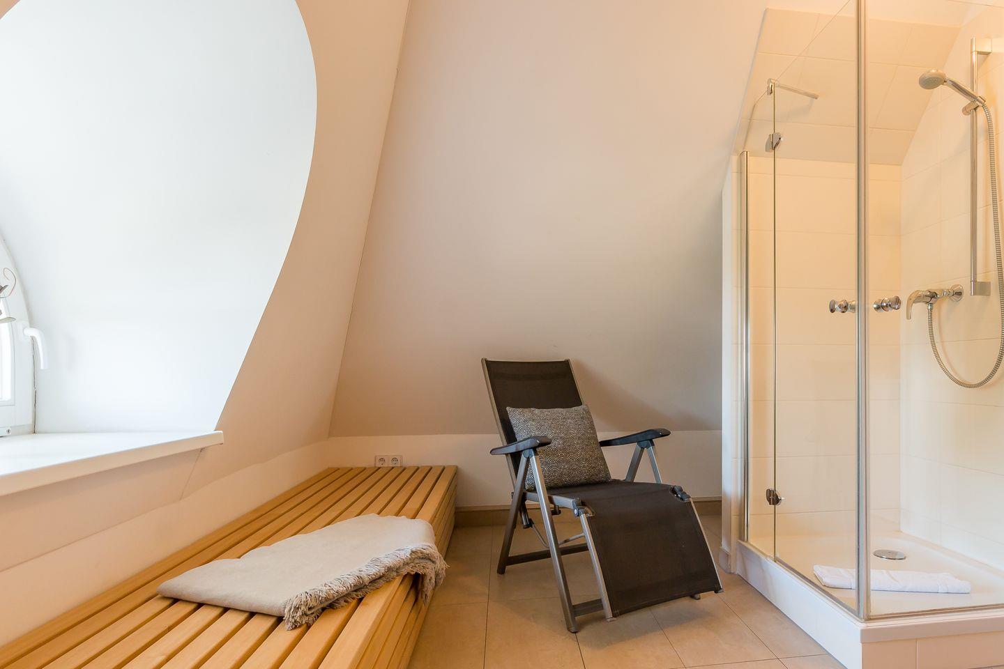 Im Erdgeschoss empfängt dich der großzügige Wohnraum mit einer gemütlichen Sitzecke am Kaminofen. Der große Essbereich mit Blick in den Garten verspricht geselligen Momente beim Essen und für Spiele. Keine Wünsche offen lässt auch der offene Küchenbereich mit seiner komfortablen und funktionalen Einbauküche. Ein Gäste-Bad mit Dusche/WC befindet sich ebenfalls auf der unteren Etage. Vom Wohnbereich gelangst du direkt auf die großzügige Terrasse. Hier lassen sich entspannte Stunden nach einem ereignisreichen Tag verleben. Das erste Obergeschoss verfügt über ein Schlafzimmer mit einem Doppelbett sowie ein weiteres Schlafzimmer mit zwei Einzelbetten. Weiterhin schließt sich das moderne Badezimmer mit Dusche/WC an. Der Spitzboden hält eine kleine Wellnessoase für dich bereit. Hier kannst du ausgiebig saunieren - ein tolles Highlight, besonders an den kühleren Tagen. Ein Ruhebereich mit Dusche gehört selbstverständlich dazu.