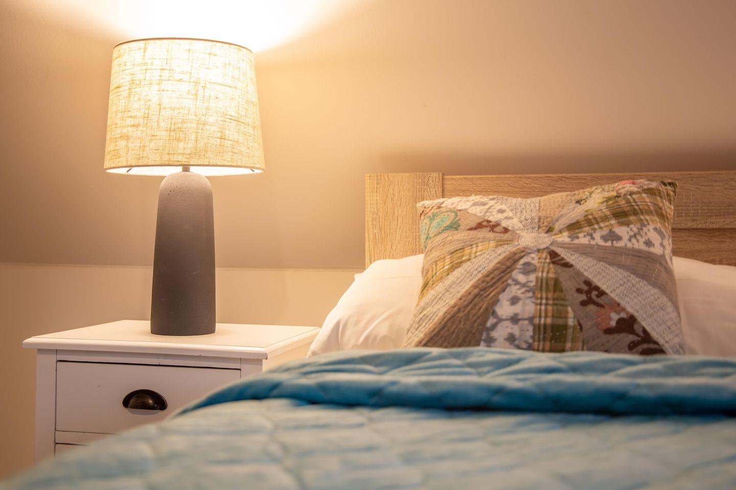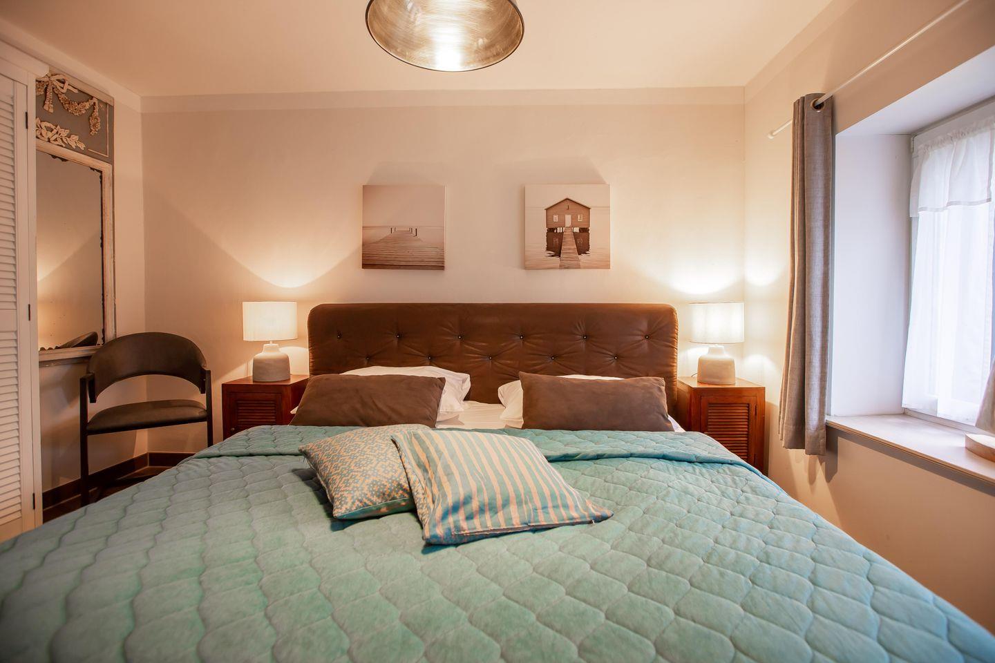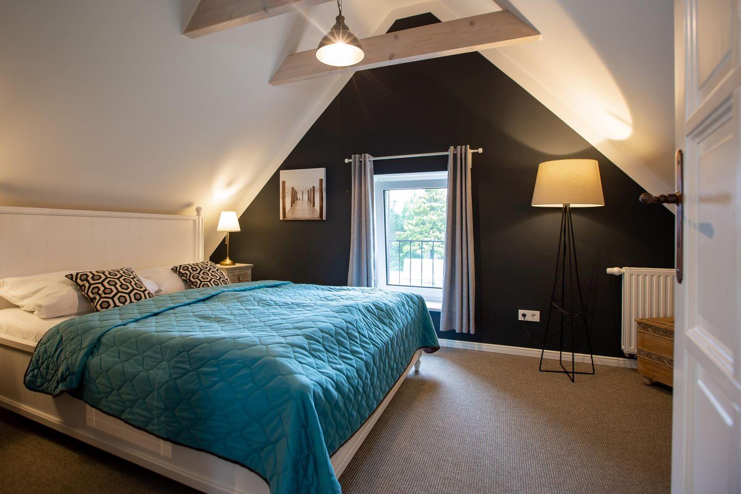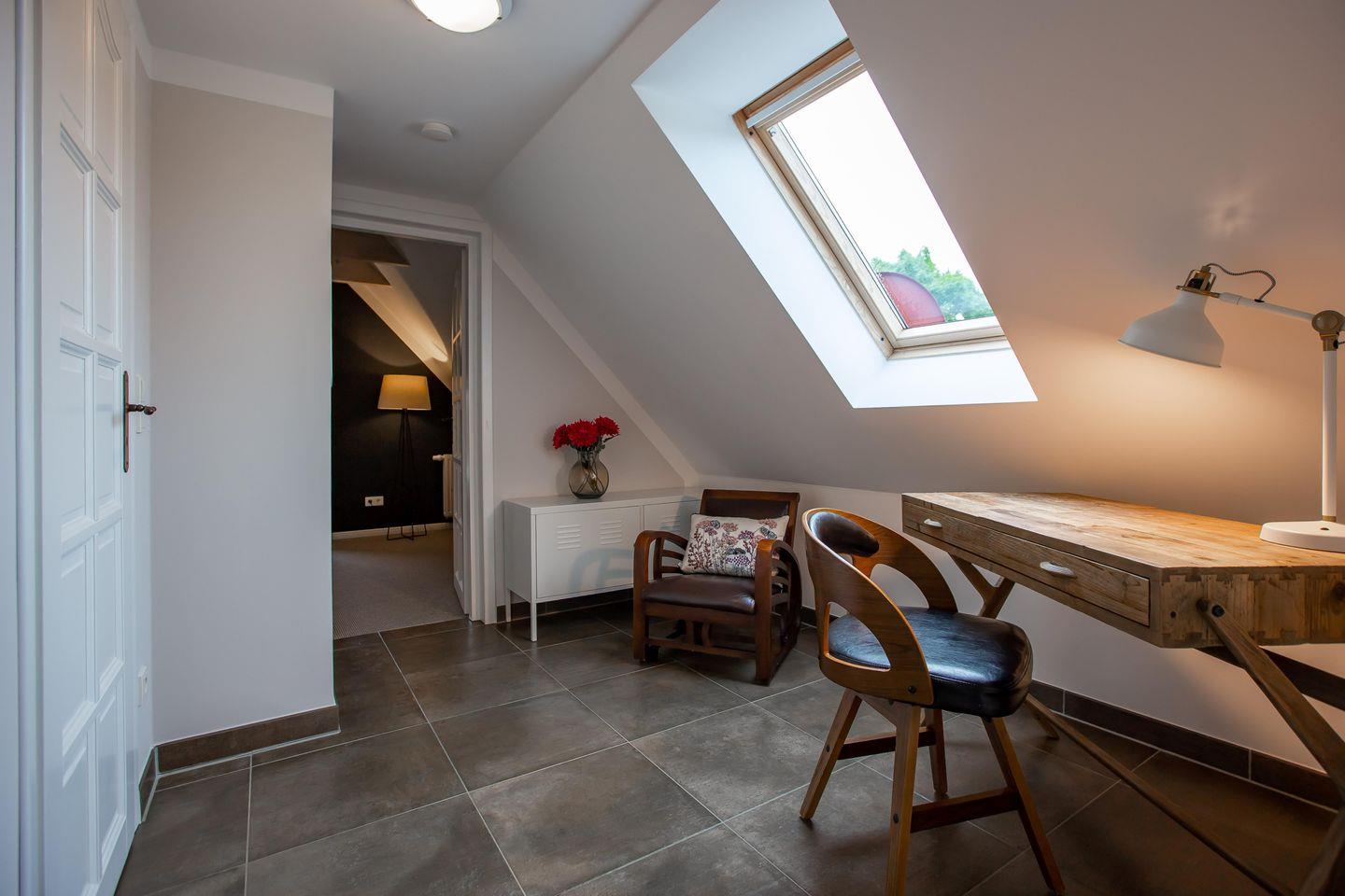 Im Obergeschoss erwarten dich zwei weitere Schlafzimmer mit Doppelbetten (160 cm und 140 cm), eines davon mit zusätzlichem TV. Ein helles Galeriezimmer mit Schreibtisch bietet dir zudem die Möglichkeit, auch im Urlaub entspannt zu arbeiten. Abgerundet wird diese Etage durch ein weiteres Badezimmer mit Dusche und WC.