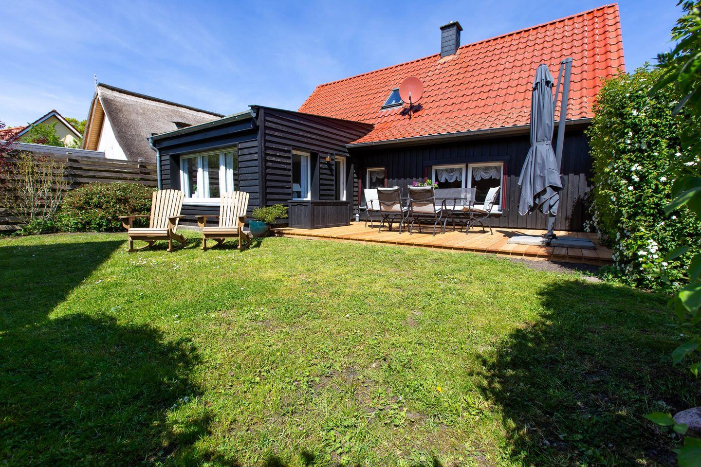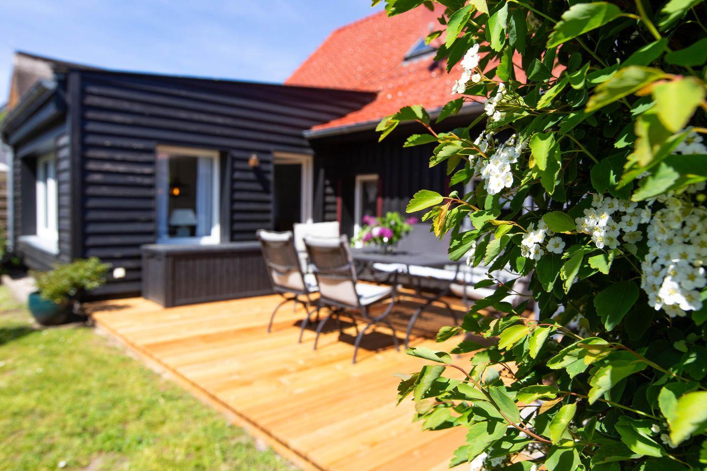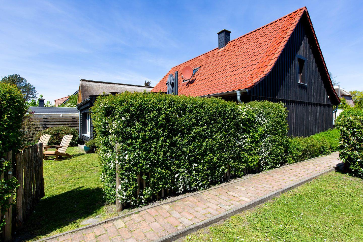 Charmantes Ferienhaus Sonnenwieck 01 in Wieck am Darß mit Naturgrundstück, Kamin und barrierefreiem Komfort für erholsame Urlaubstage.