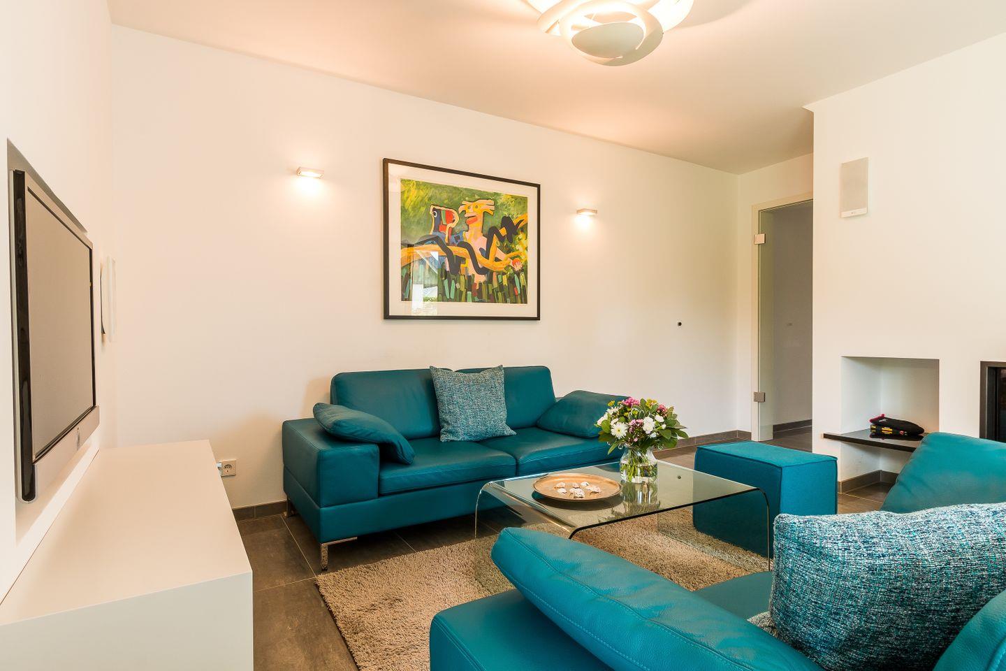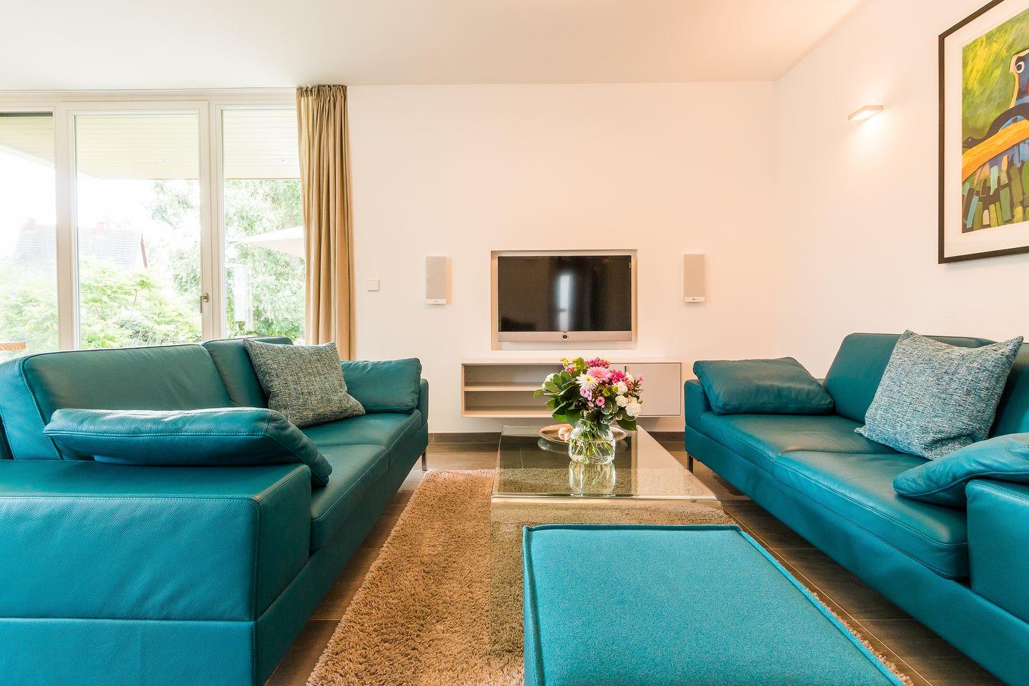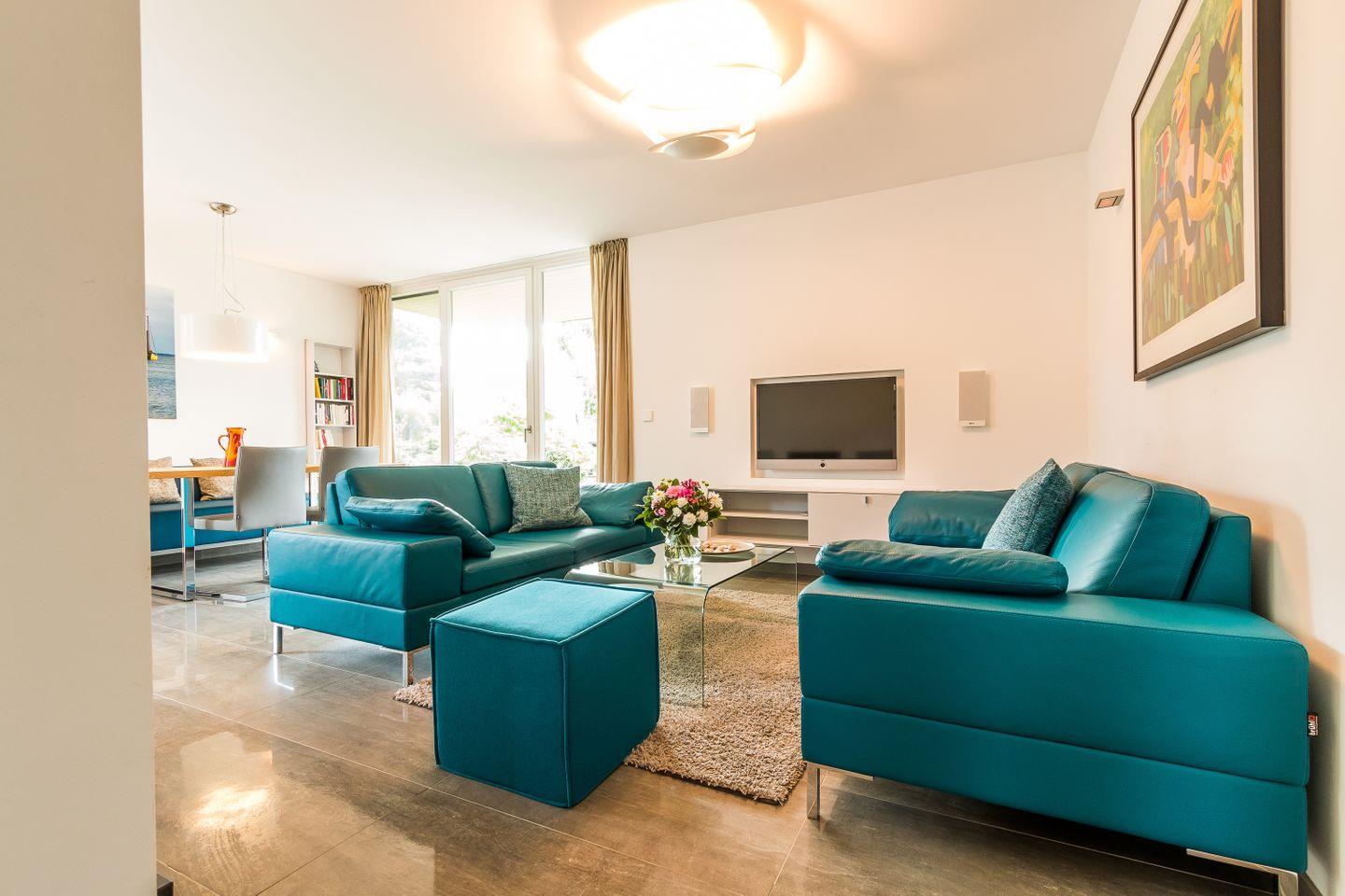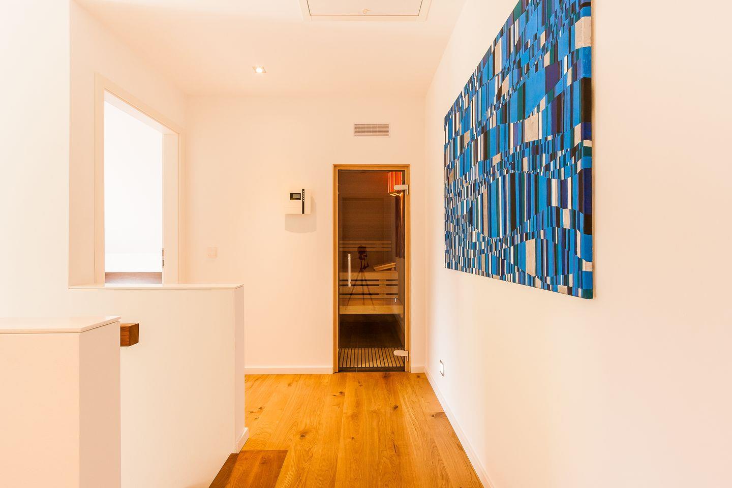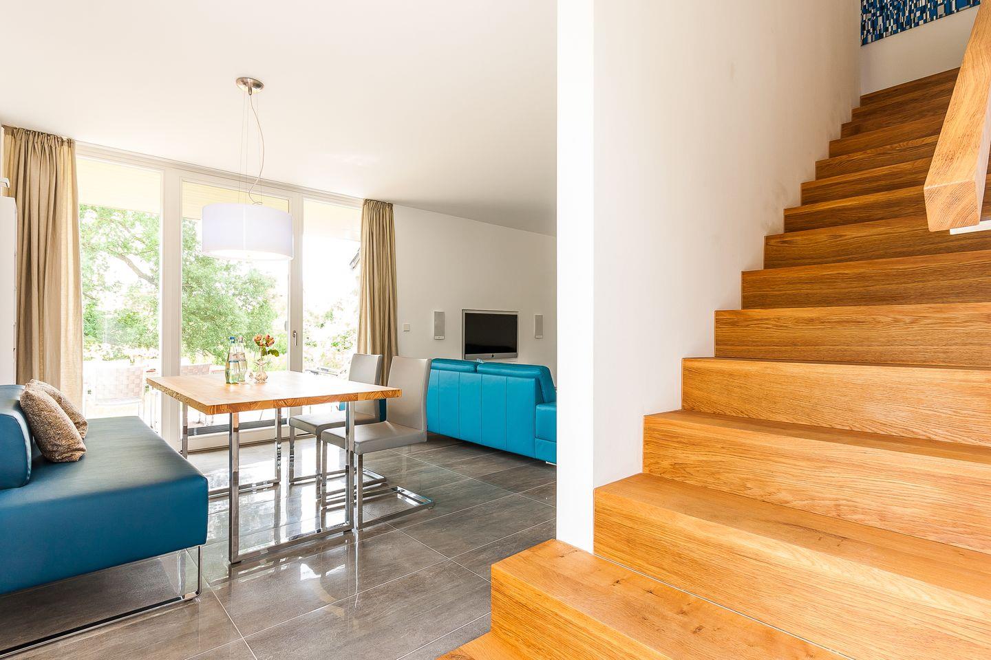 Im Zweienhaus trifft moderne Architektur auf eine stilvolle Innenausstattung. Dank des hochwertigen Interieurs lässt die Doppelhaushälfte keine Wünsche offen und ist Garant für einen rundum gelungenen Urlaub. Du gelangst über den großzügigen Eingangsbereich direkt in den modernen Wohnraum, der über eine hochwertige Ledersitzgruppe verfügt. Der lichtdurchflutete Essbereich mit wunderbarem Ausblick ins Grüne und ein Kaminofen fügen sich harmonisch ein. Weiterhin befindet sich im Erdgeschoss der offene und sehr gut ausgestattete Küchenbereich, der etwas vom Wohnbereich separiert ist. Ein Bad mit Dusche/WC und ein Hauswirtschaftsraum mit Waschtrockner sind ebenfalls auf dieser Etage untergebracht. Das Dachgeschoss beherbergt zwei Schlafzimmer, die jeweils mit einem Doppelbett und mit geräumigen Einbauschränken ausgestattet sind. Eines der beiden Schlafzimmer bietet ein zusätzliches TV-Gerät. Das Badezimmer mit Dusche/WC sowie ein kleiner Wellnessbereich mit eigener Sauna sorgen für Wohn- und Wohlfühlkomfort zu jeder Jahreszeit.