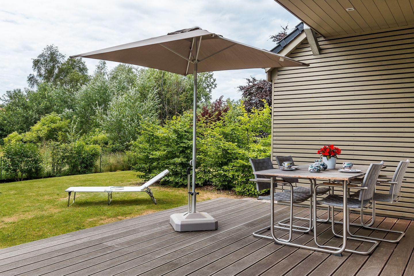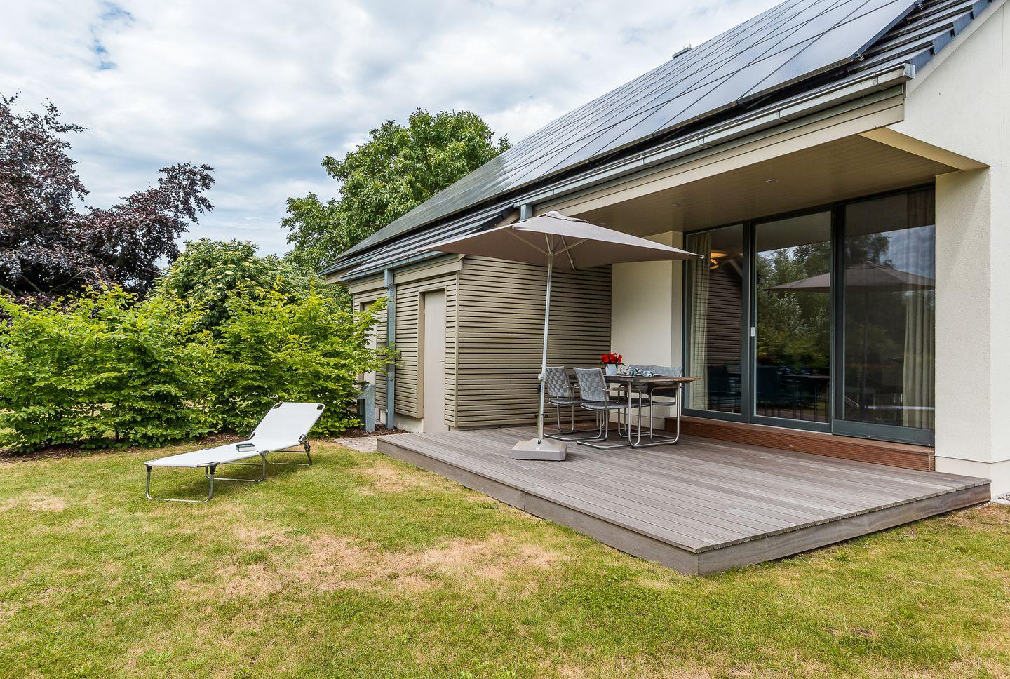 Die großzügige und teilweise überdachte Terrasse mit angrenzender Rasenfläche runden das Gesamtbild ab. Hier kannst du genussvoll in den Tag starten oder die lauen Sommernächte mit einem Grillabend und einem guten Glas Wein ausklingen lassen. Sonnenliegen, ein Grill, ein abschließbarer Fahrradschuppen und ein PKW-Stellplatz runden den Außenbereich ab.