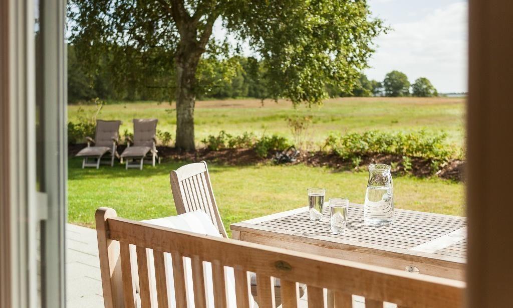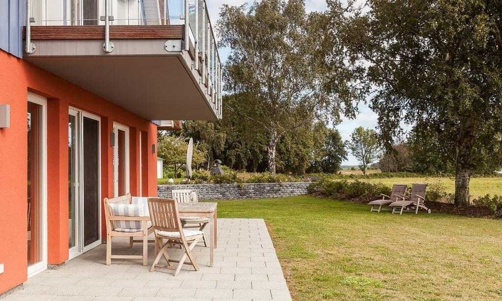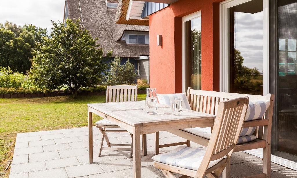 Eine Steinterrasse mit hochwertigen Möbeln und teils überdacht gehört ebenfalls zur Ferienwohnung. Von hier hast du einen fantastischen Blick über die Wiesen bis zum Bodden. Der Garten samt Sonnenliegen kann von beiden Parteien genutzt werden. Außerdem steht dir ein PKW-Stellplatz zur Verfügung.