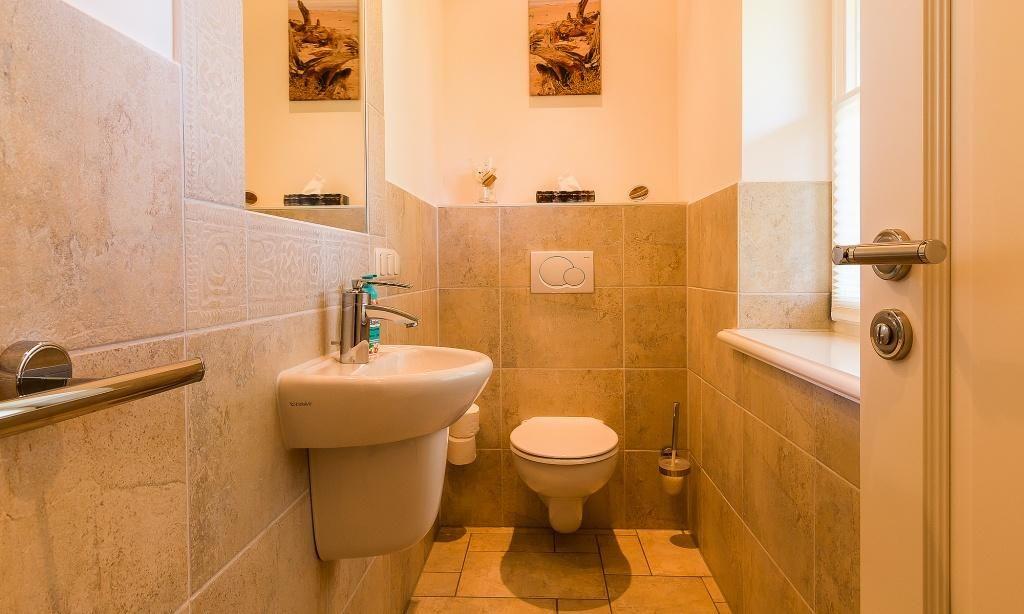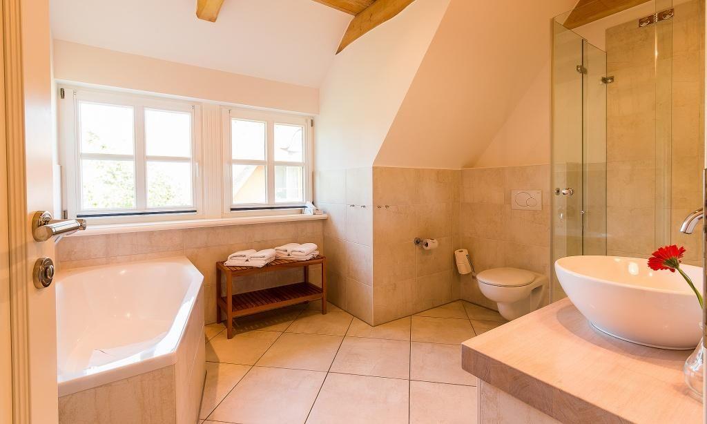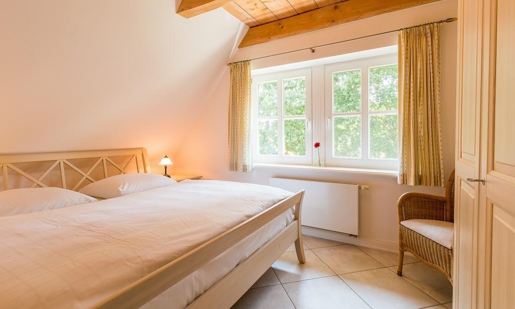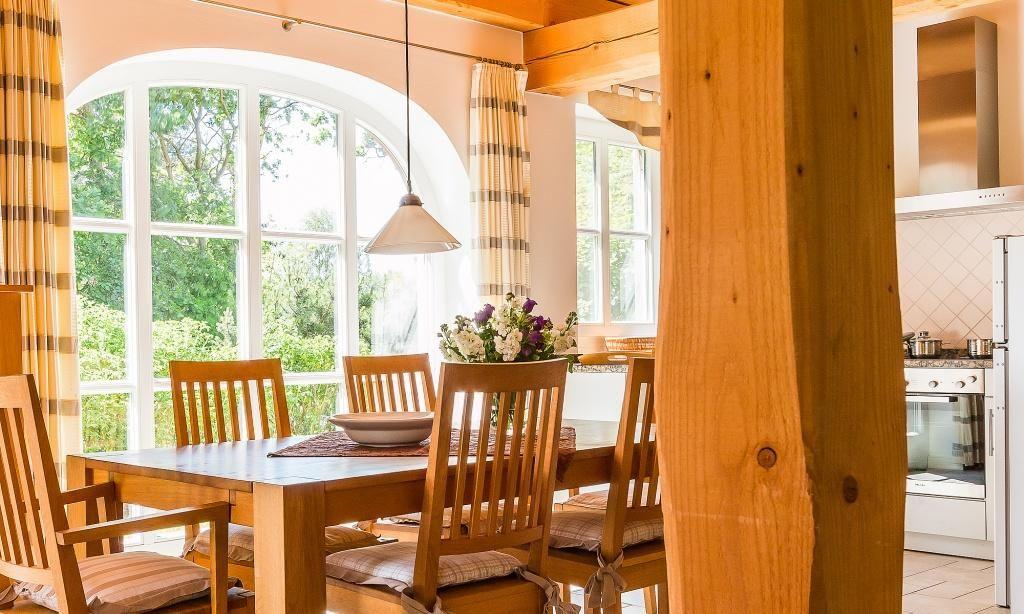 Im Erdgeschoss erwartet dich ein großzügiger und sonnendurchfluteter Wohnbereich, der mit seiner Holzständerbauweise und offenem Fachwerk für besondere Wohnatmosphäre sorgt. Mit seiner gemütlichen Couch, der offenen Küche und dem geselligen Essbereich wird der Wohnbereich schnell zum Mittelpunkt des Hauses. Weiterhin befinden sich im Erdgeschoss ein Gäste-WC sowie ein Hauswirtschaftsraum. Über eine wunderschöne Echtholztreppe gelangst du ins Obergeschoss. Hier befinden sich die drei Schlafzimmer, die jeweils mit einem Doppelbett ausgestattet sind. Ein großes Bad mit Badewanne und Dusche/WC liegt ebenfalls auf dieser Etage. Ankommen und sofort Urlaubs-Feeling spüren - das geht mit diesem wundervollen Ferienhaus unter Reet.
