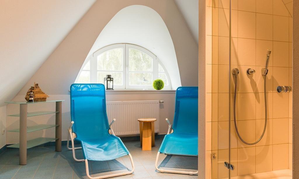 Über eine Naturholztreppe gelangst du in das Obergeschoss. Hier befinden sich die drei Schlafzimmer, die mit je einem Doppelbett ausgestattet sind. Warme Farben, hochwertige Holzmöbel und der Dielenboden sorgen für zusätzliche Behaglichkeit, die den Schlaf fördert und dir erholsame Nächte schenkt. Ein weiteres Badezimmer mit Dusche und WC ist ebenfalls auf dieser Etage untergebracht. Eine eigene kleine Wellness-Oase wartet im Spitzboden auf dich. Denn die Klafs-Sauna und die angrenzende Schwalldusche sorgen für die richtige Entspannung nach einem aktiven Urlaubstag und bieten Wohlfühlkomfort zu jeder Jahreszeit. Das separate WC rundet den Wellnessbereich perfekt ab.