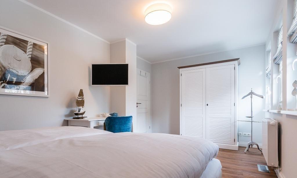 Im Dachgeschoss befindet sich ein drittes Schlafzimmer mit zwei Einzelbetten als zusätzliches Kinderzimmer oder Rückzugsort. Von hier hast du einen kleinen Boddenblick.