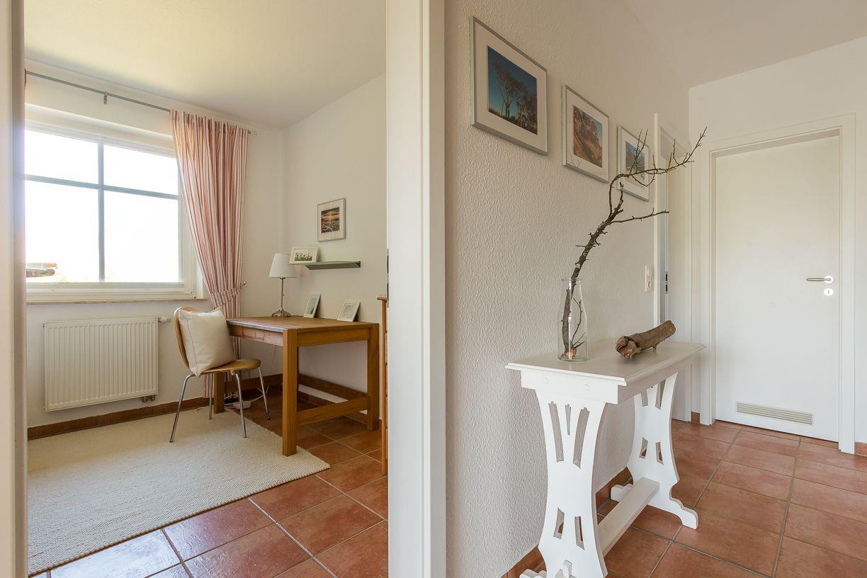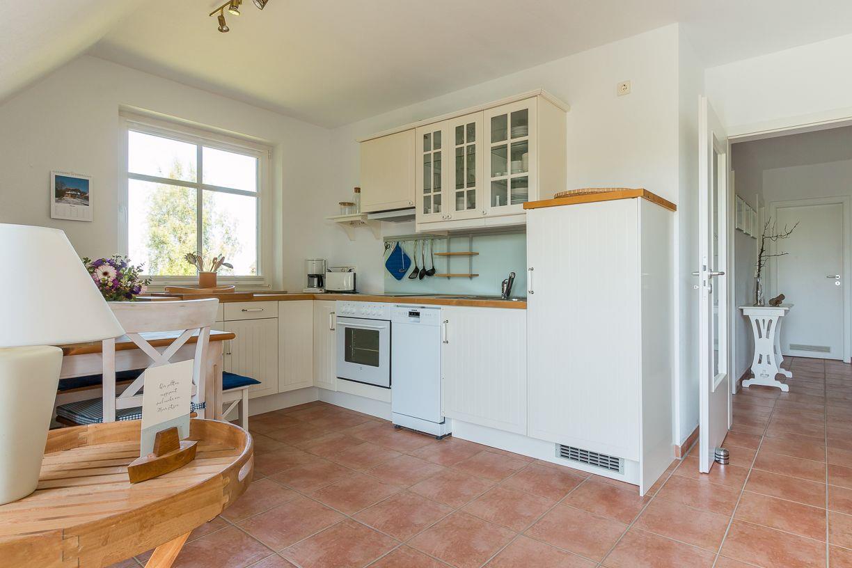 Die Ferienwohnung befindet sich im ersten Obergeschoss und ist über eine kurze Treppe zu erreichen. Lichtdurchflutete Räume und helle, freundliche Farben lassen sofort Urlaubsfeeling aufkommen. Der offene Wohn- und Küchenbereich ist Mittelpunkt der Wohnung. Mit seiner gemütlichen Sofagarnitur, dem Esstisch und der vollausgestatteten Küchenzeile kannst du hier nach Herzenslust klönen, kochen und entspannen. Die zwei Schlafzimmer sind harmonisch und geräumig gestaltet. Das Hauptschlafzimmer ist mit einem Doppelbett ausgestattet, ein zweites Schlafzimmer besitzt ein Kojenbett für eine dritte Person. Abgerundet wird der Wohnkomfort mit einem Badezimmer mit Dusche, WC und Waschmaschine sowie einem zweiten Gäste-WC.