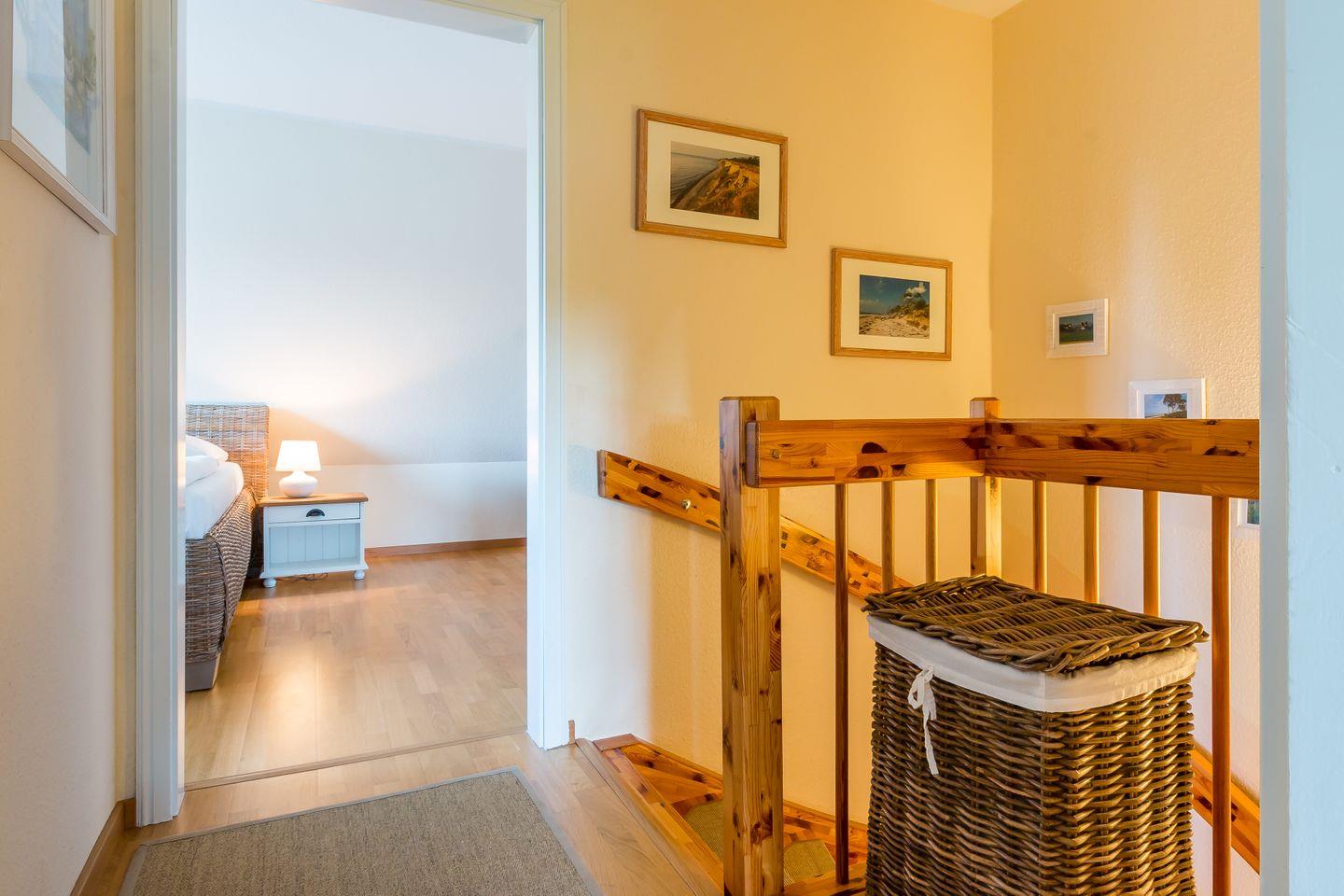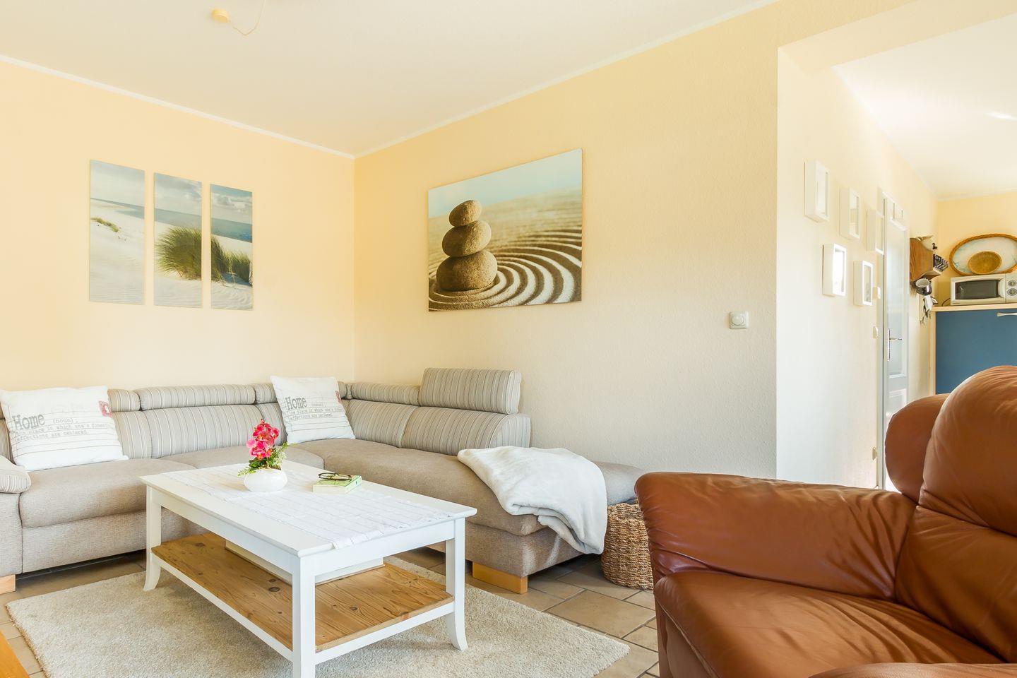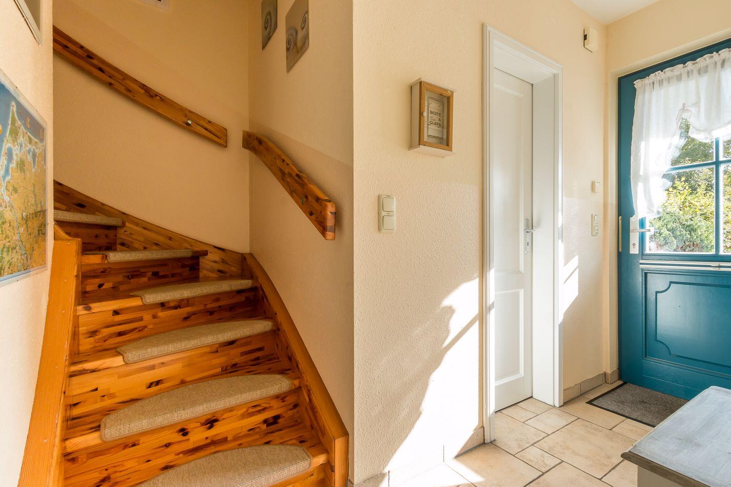 Im Erdgeschoss befindet sich der helle, freundliche Wohnraum mit einer gemütlichen Sitzecke sowie einem einladenden Essplatz. Die Küchenzeile ist integriert und schafft einen offenen Wohncharakter. Ebenfalls auf der unteren Etage: ein Gäste-WC und ein kleiner Flur. Das Obergeschoss beherbergt ein heimeliges Schlafzimmer mit einem Doppelbett sowie ein weiteres Schlafzimmer mit zwei Einzelbetten. Ein Schreibtisch und stabiles Internet stehen ebenfalls bereit, falls man den Urlaub mit der Arbeit verbinden möchte. Ein zweites Bad mit Dusche/WC auf der oberen Etage sorgt für zusätzlichen Wohnkomfort.