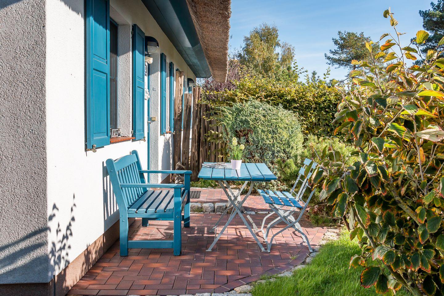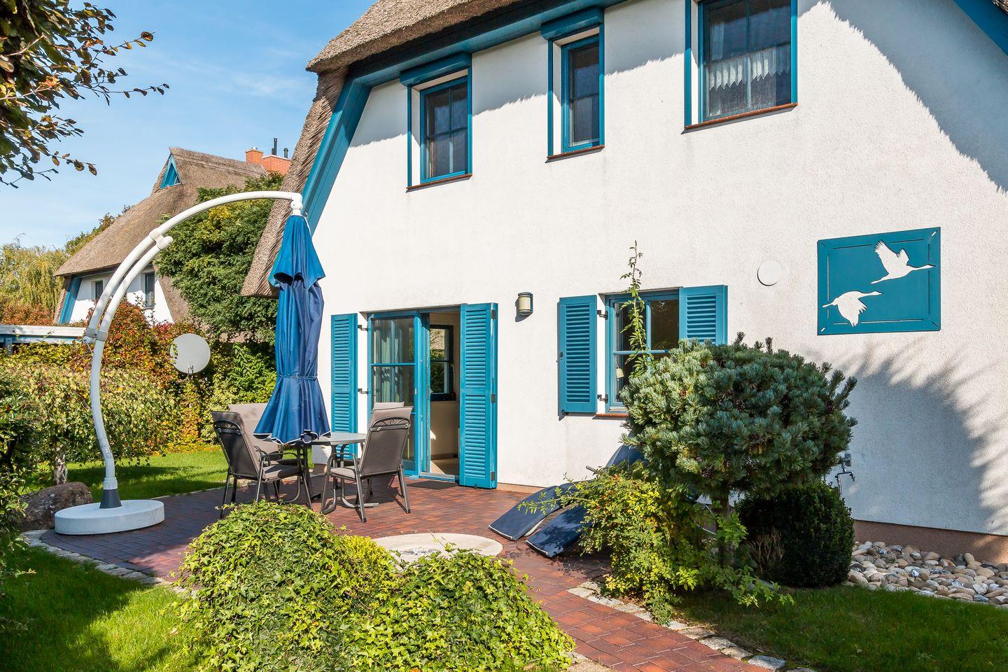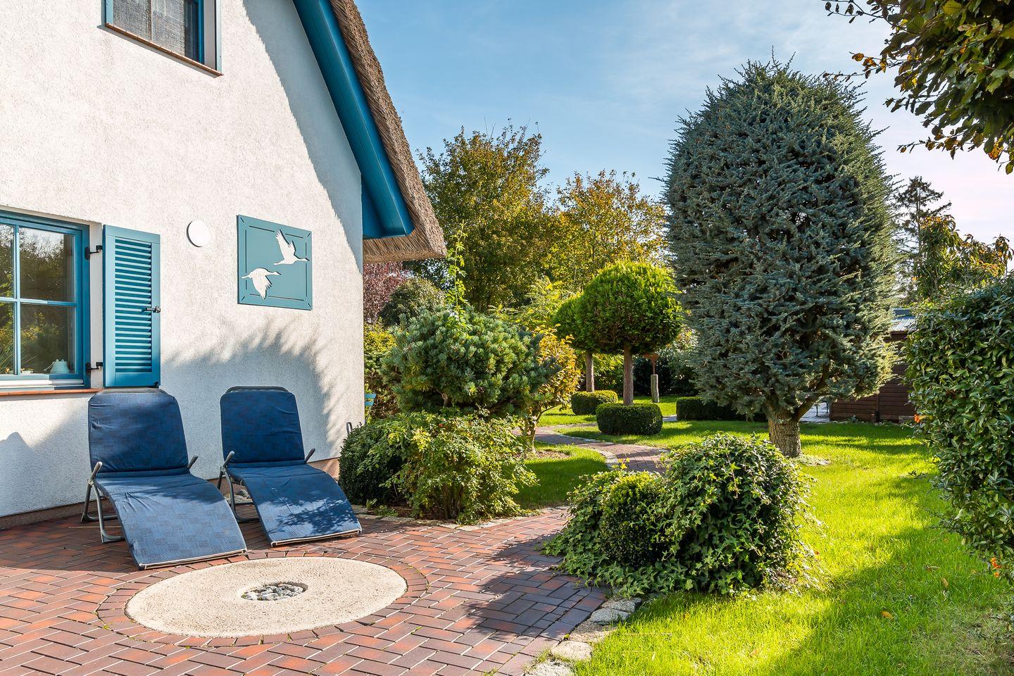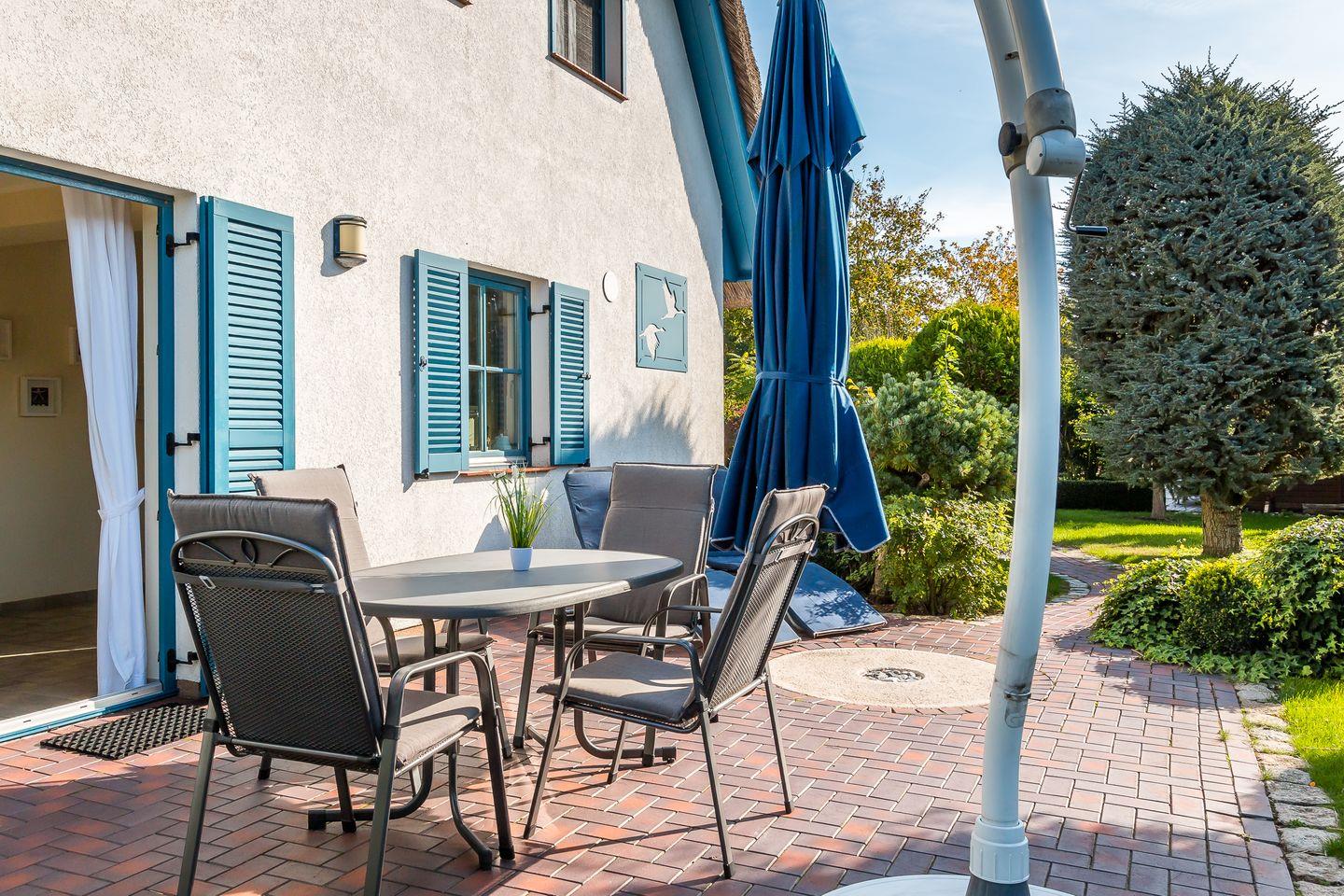 Gemütliche Doppelhaushälfte mit Garten, Grillplatz und zwei Terrassen in Wieck am Darß, ideal für entspannte Urlaubstage.