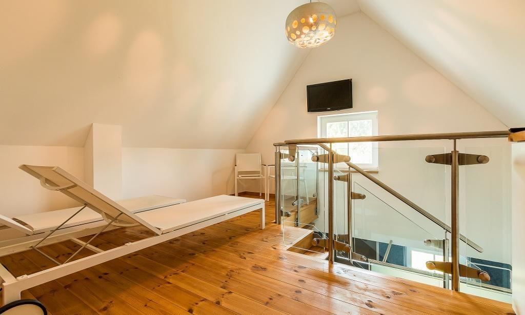 Im Anbau des Hauses wurde eine Wellnessoase geschaffen, die sich über zwei Ebenen erstreckt und gerade an kühleren Tagen eine willkommene Abwechslung bietet. Hier ist eine Sauna mit Dusche untergebracht sowie ein Ruhebereich mit Entspannungsliegen in der Galerie. Der Wellnessbereich wird gemeinschaftlich mit der Nachbarhaushälfte genutzt.