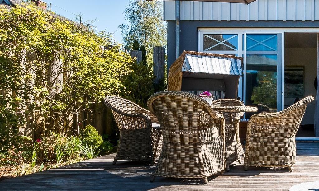 Im Außenbereich erwartet dich ein kleiner gepflegter Garten mit einer herrlichen Holzterrasse und hochwertiger Bestuhlung und Sonnenliegen. Zum Ferienhaus gehören zwei PKW-Stellplätze.