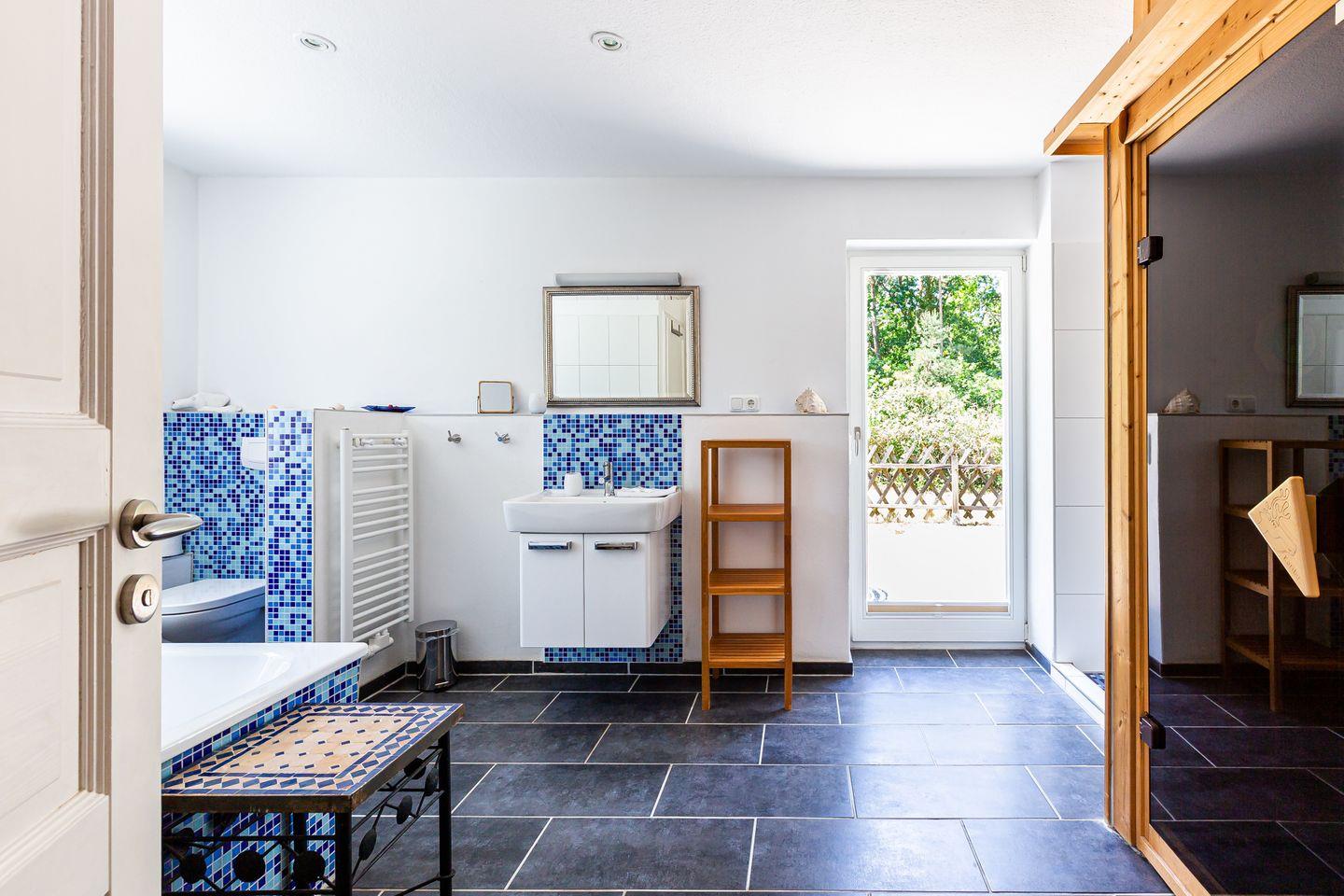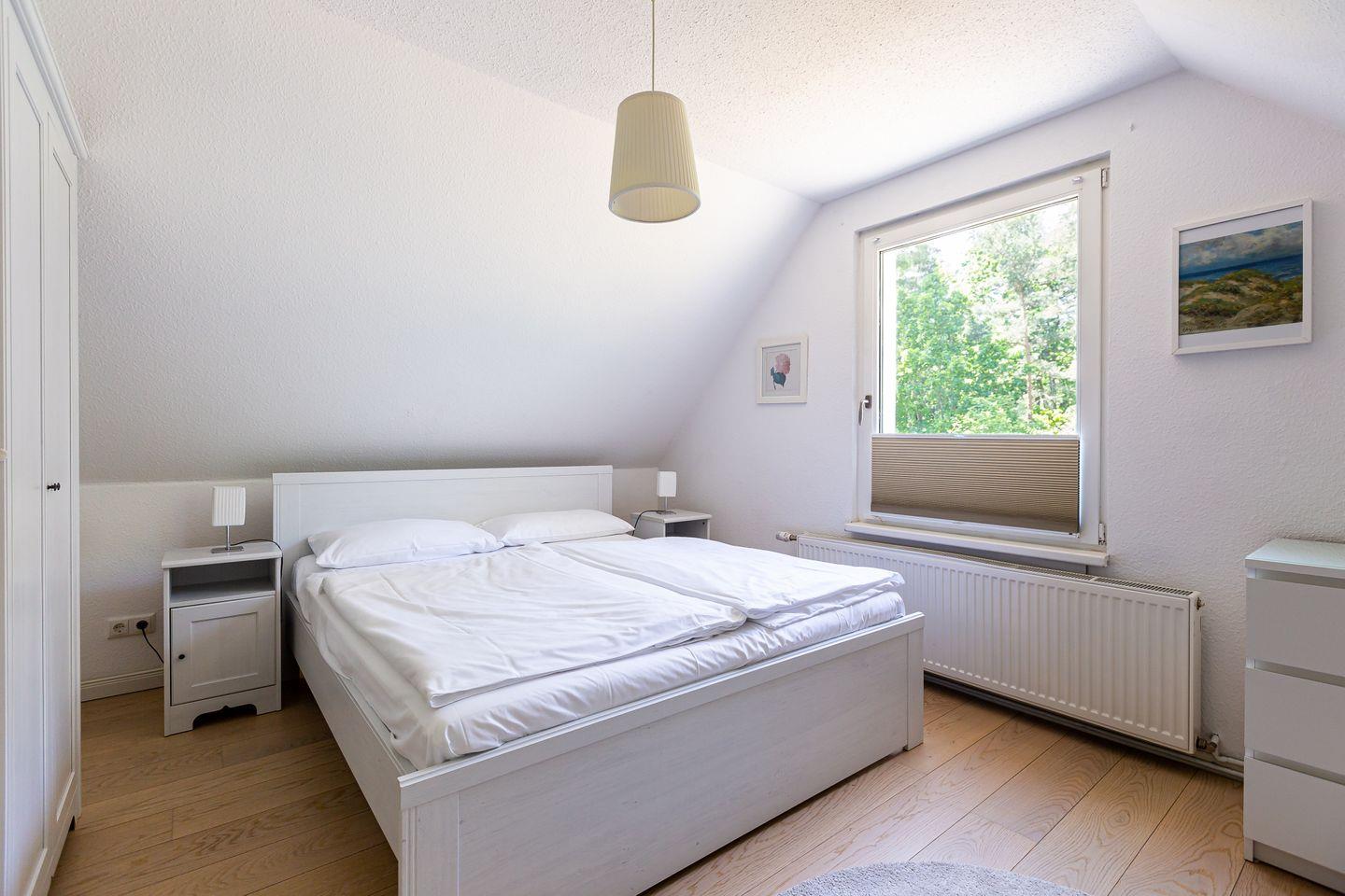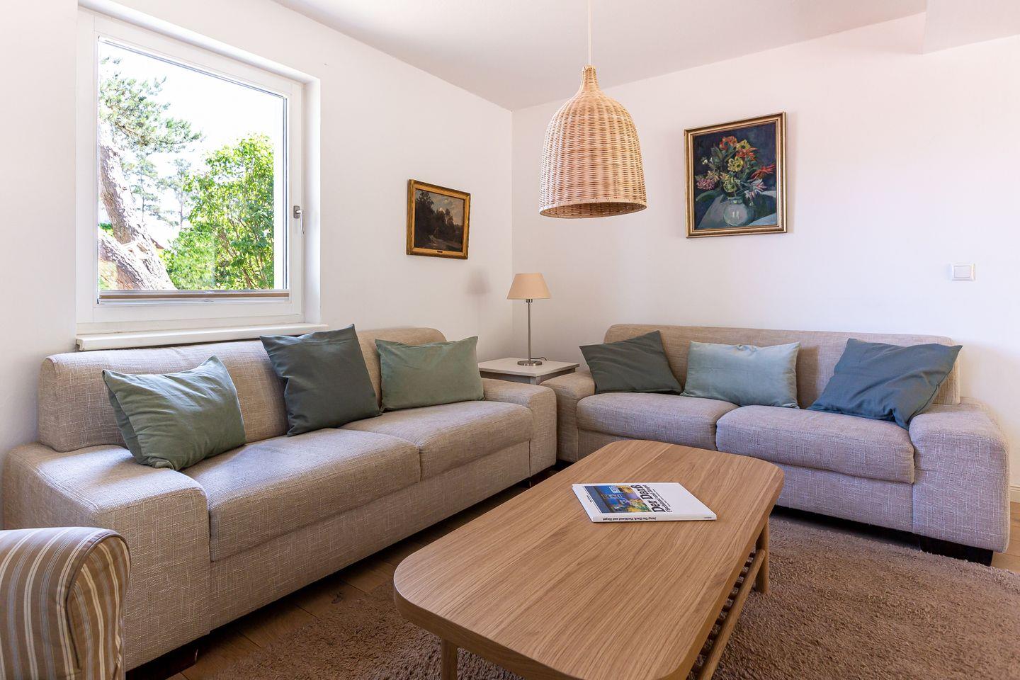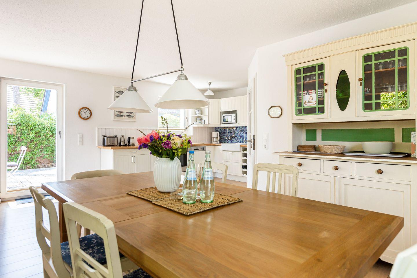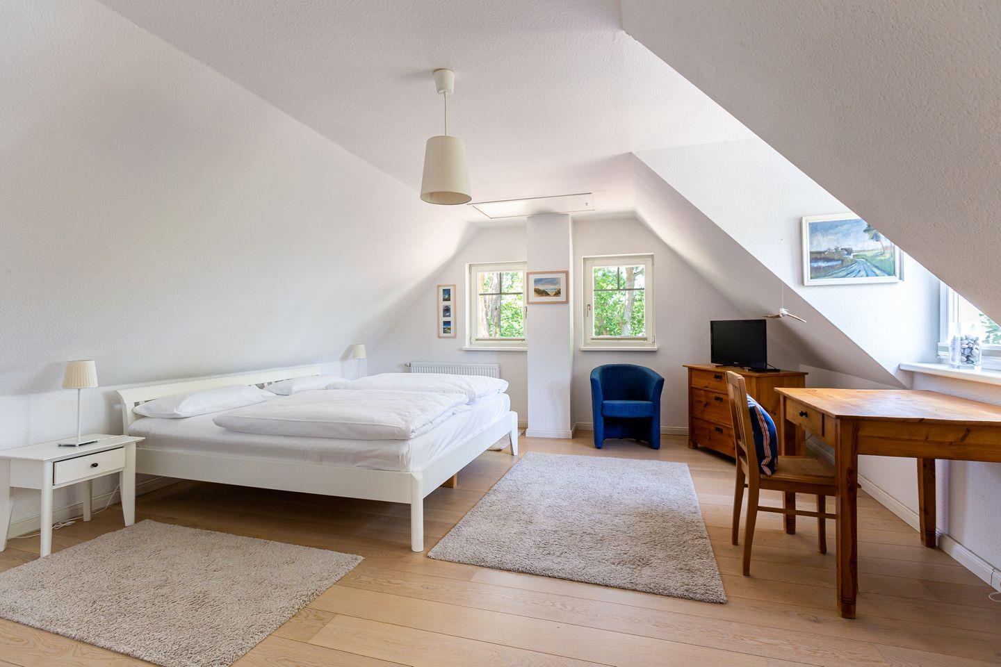 Durch den Eingangsbereich mit einer original Darßer Haustür gelangst du in den einladenden Wohnraum, der über eine gemütliche Sitzecke am Kaminofen, Bibliothek, Leseecke mit Ohrensessel und Zugang zur Westterrasse verfügt. Die großzügige, bestens ausgestattete Küche befindet sich separat. Besonders schön ist der edle und große Landhaustisch, an dem die ganze Familie Platz hat. Von der Küche hast du Zugang zur Süd-/Ost-Terrasse. Für ein besonderes Urlaubsfeeling sorgt das Wellnessbad mit Sauna, Badewanne und großem Austritt auf die West-Terrasse. Im Obergeschoss befindet sich ein großes Schlafzimmer mit Doppelbett, TV und Schreibtisch. Dank der schnellen Internetverbindung mit 100 MBit/s kannst du deinen Urlaub auch mit der Arbeit verbinden. Des Weiteren befindet sich ein zweites Schlafzimmer, ebenfalls mit einem Doppelbett und wunderbarem Waldblick und ein drittes Schlafzimmer mit zwei Einzelbetten im Obergeschoss. Für zusätzlichen Wohnkomfort sorgt ein zweites Bad mit Dusche/WC auf der oberen Etage.