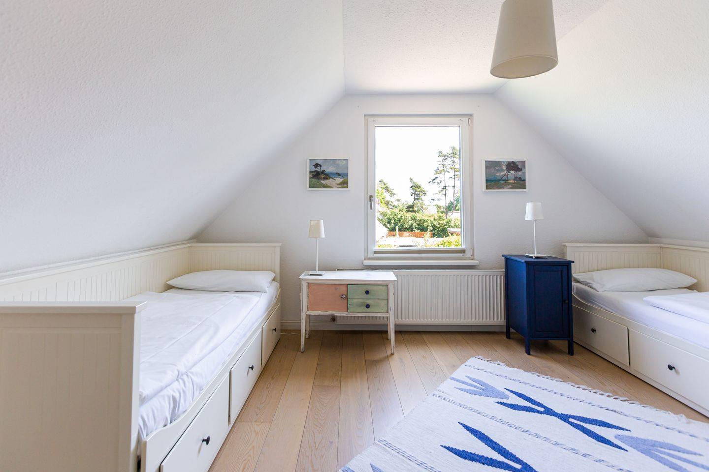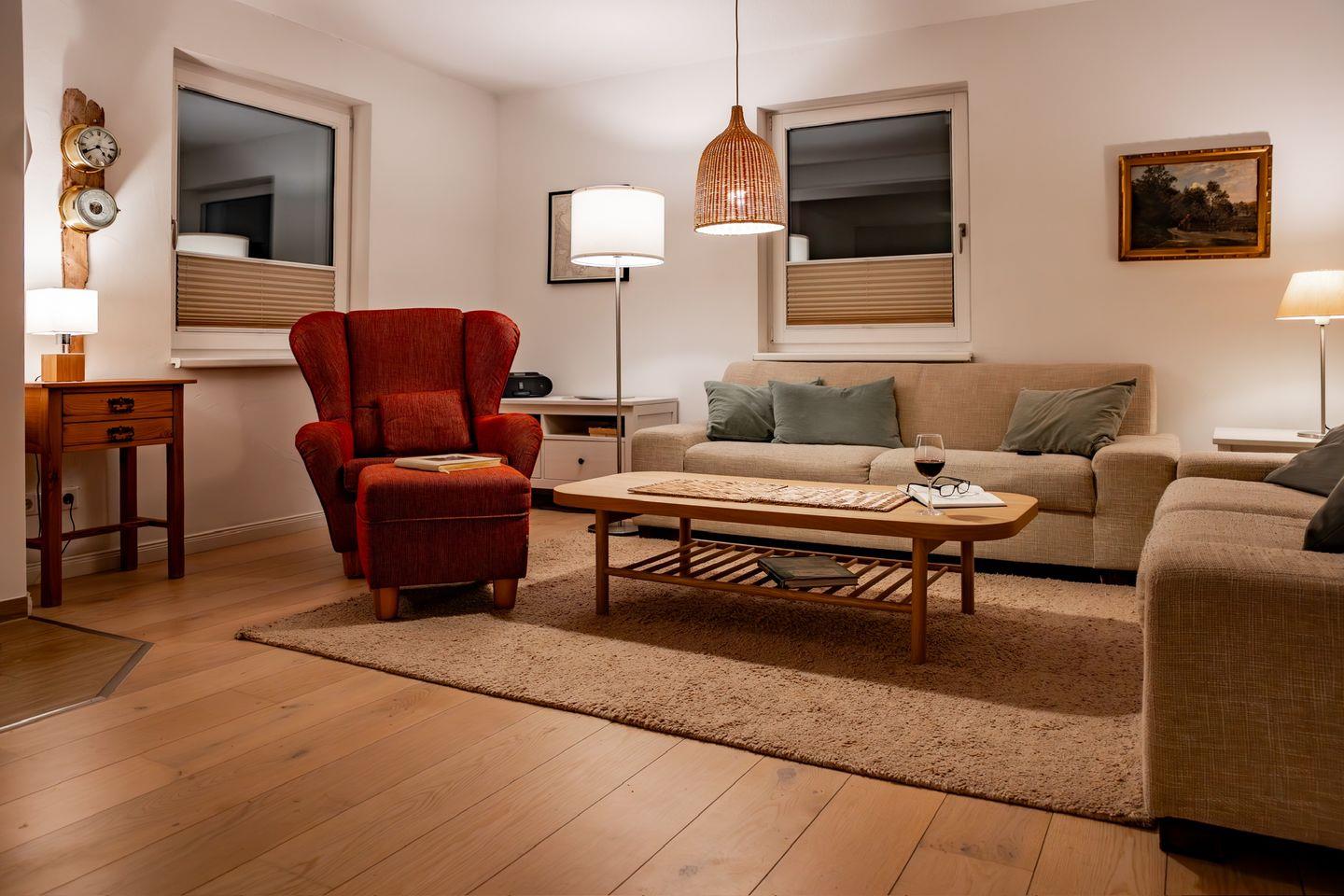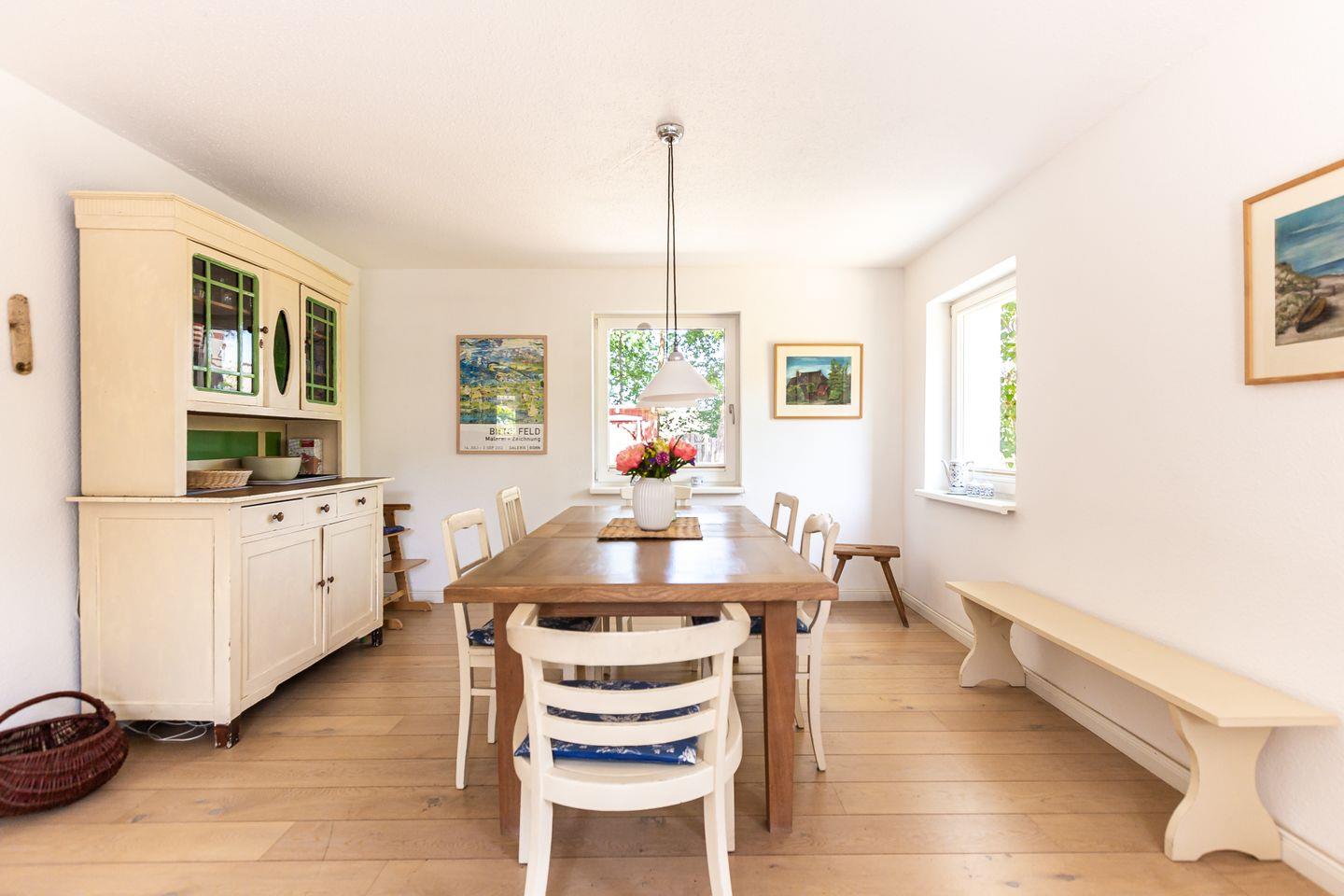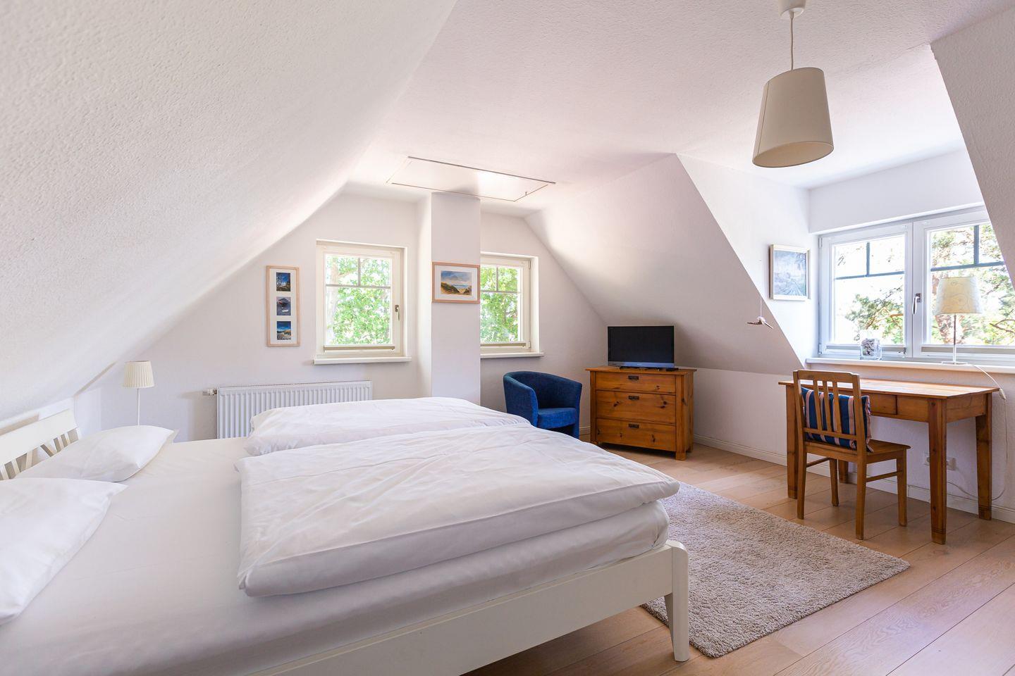 Durch den Eingangsbereich mit einer original Darßer Haustür gelangst du in den einladenden Wohnraum, der über eine gemütliche Sitzecke am Kaminofen, Bibliothek, Leseecke mit Ohrensessel und Zugang zur Westterrasse verfügt. Die großzügige, bestens ausgestattete Küche befindet sich separat. Besonders schön ist der edle und große Landhaustisch, an dem die ganze Familie Platz hat. Von der Küche hast du Zugang zur Süd-/Ost-Terrasse. Für ein besonderes Urlaubsfeeling sorgt das Wellnessbad mit Sauna, Badewanne und großem Austritt auf die West-Terrasse. Im Obergeschoss befindet sich ein großes Schlafzimmer mit Doppelbett, TV und Schreibtisch. Dank der schnellen Internetverbindung mit 100 MBit/s kannst du deinen Urlaub auch mit der Arbeit verbinden. Des Weiteren befindet sich ein zweites Schlafzimmer, ebenfalls mit einem Doppelbett und wunderbarem Waldblick und ein drittes Schlafzimmer mit zwei Einzelbetten im Obergeschoss. Für zusätzlichen Wohnkomfort sorgt ein zweites Bad mit Dusche/WC auf der oberen Etage.