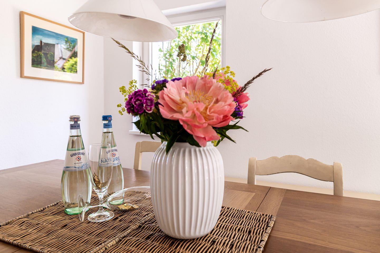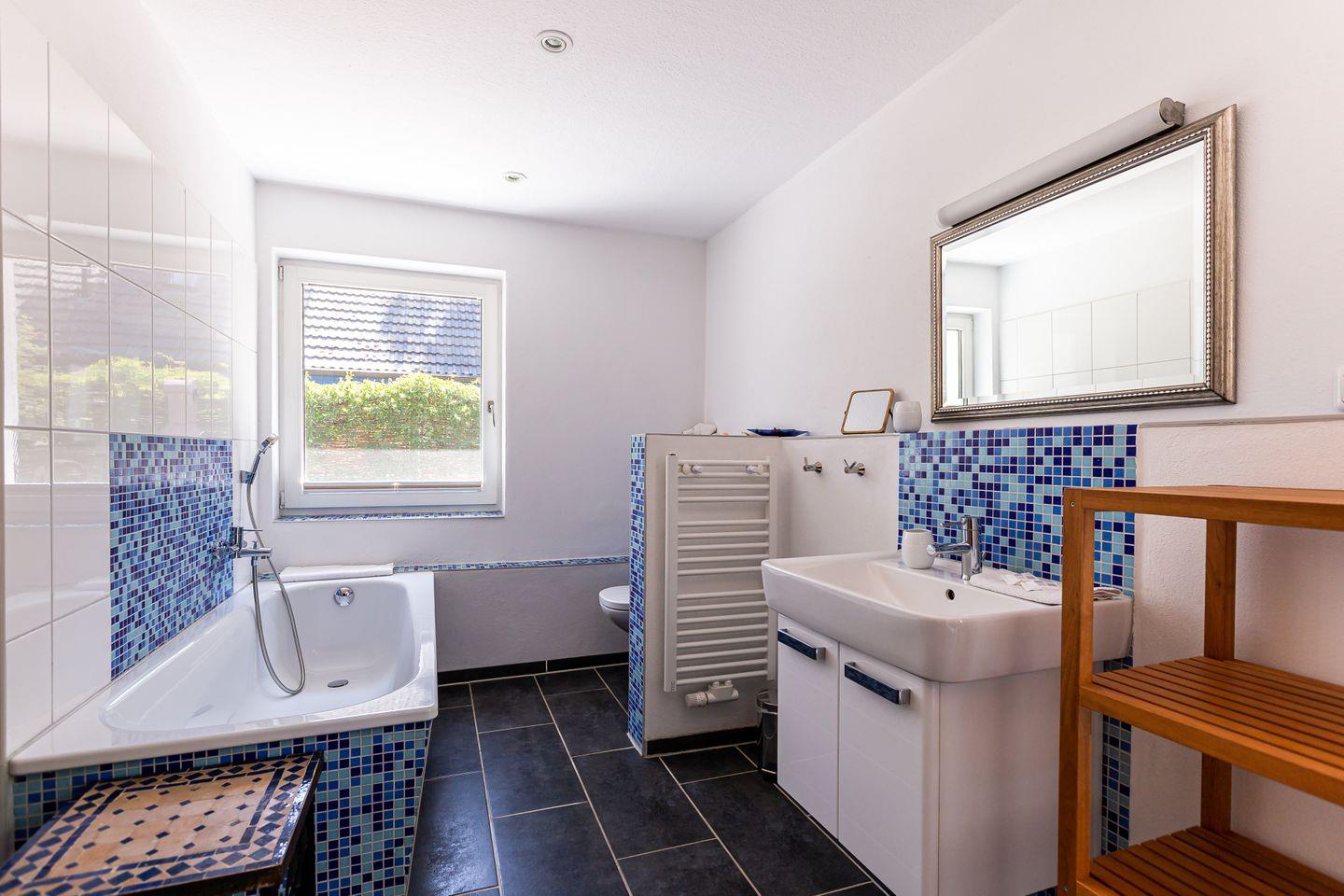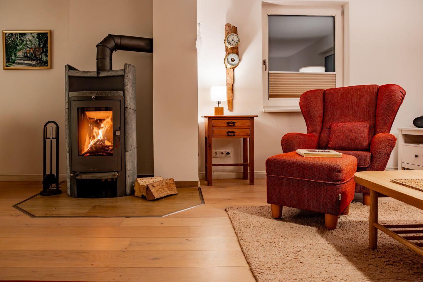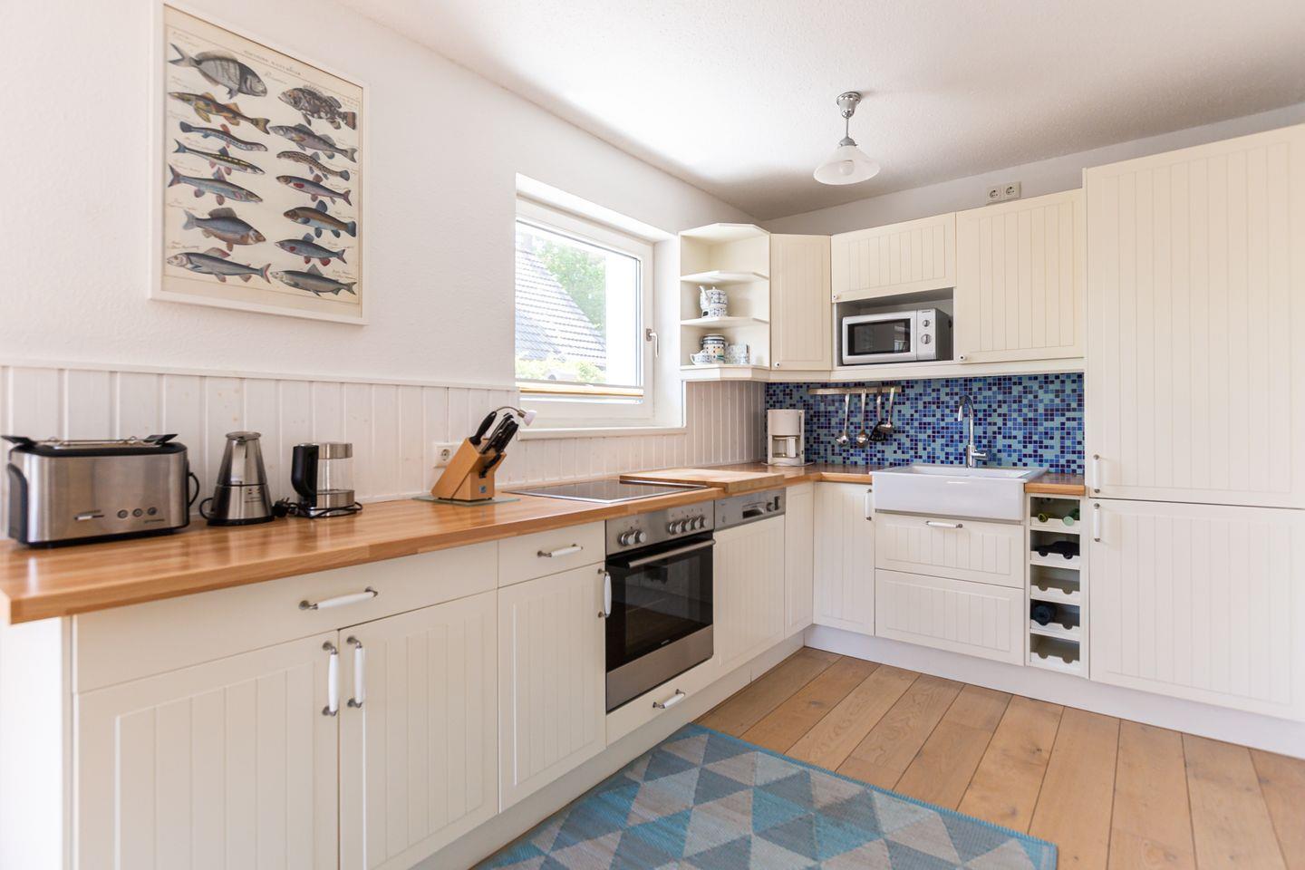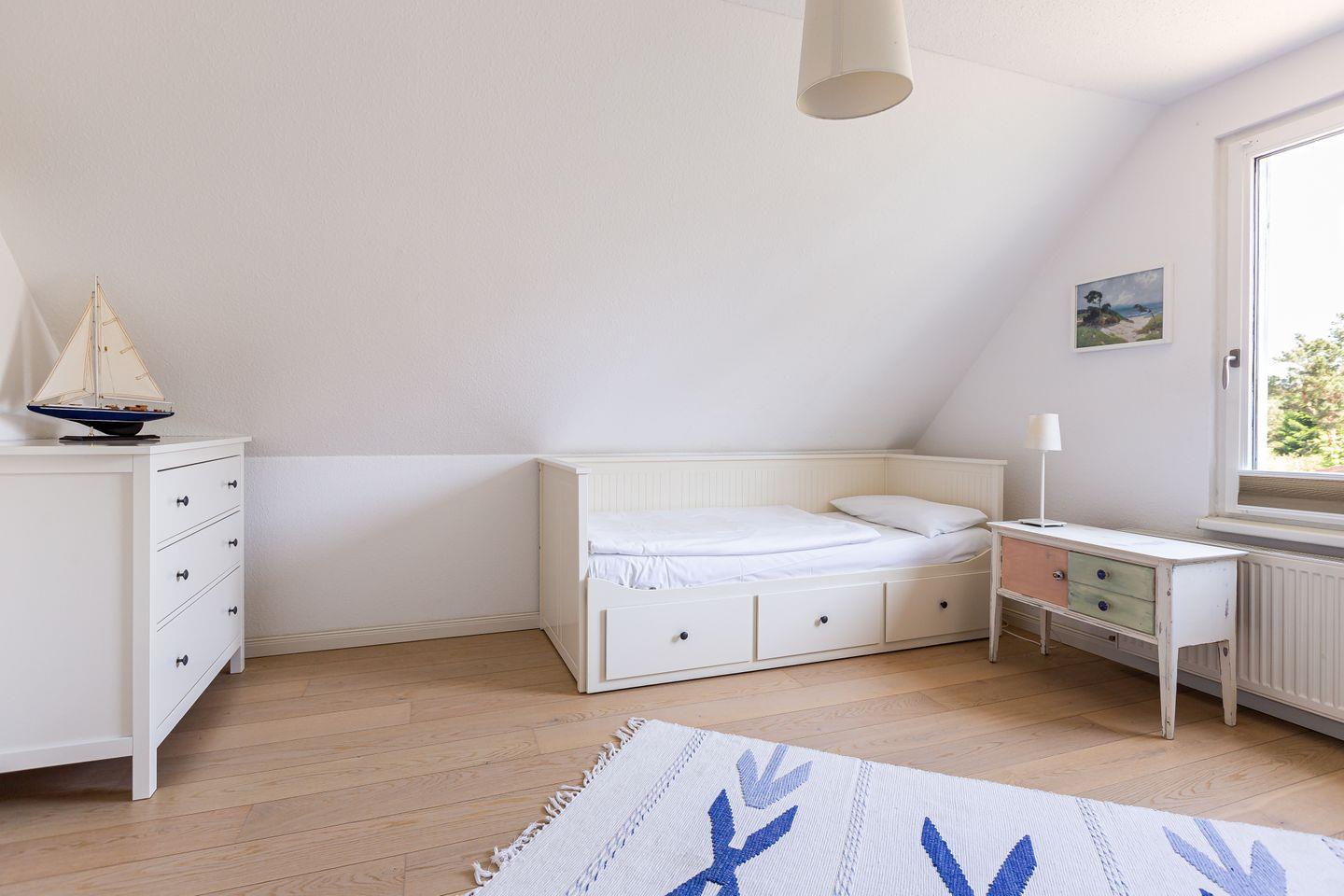 Durch den Eingangsbereich mit einer original Darßer Haustür gelangst du in den einladenden Wohnraum, der über eine gemütliche Sitzecke am Kaminofen, Bibliothek, Leseecke mit Ohrensessel und Zugang zur Westterrasse verfügt. Die großzügige, bestens ausgestattete Küche befindet sich separat. Besonders schön ist der edle und große Landhaustisch, an dem die ganze Familie Platz hat. Von der Küche hast du Zugang zur Süd-/Ost-Terrasse. Für ein besonderes Urlaubsfeeling sorgt das Wellnessbad mit Sauna, Badewanne und großem Austritt auf die West-Terrasse. Im Obergeschoss befindet sich ein großes Schlafzimmer mit Doppelbett, TV und Schreibtisch. Dank der schnellen Internetverbindung mit 100 MBit/s kannst du deinen Urlaub auch mit der Arbeit verbinden. Des Weiteren befindet sich ein zweites Schlafzimmer, ebenfalls mit einem Doppelbett und wunderbarem Waldblick und ein drittes Schlafzimmer mit zwei Einzelbetten im Obergeschoss. Für zusätzlichen Wohnkomfort sorgt ein zweites Bad mit Dusche/WC auf der oberen Etage.