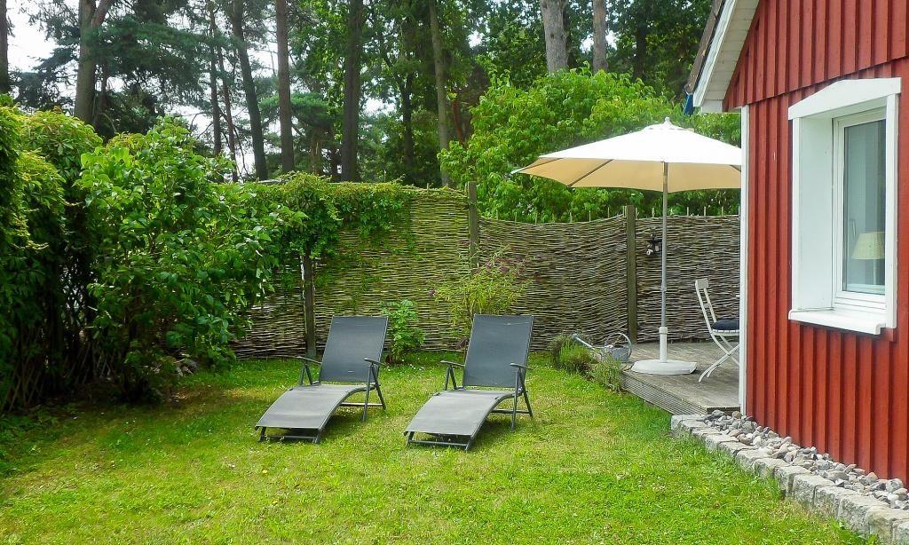 Der Außenbereich begeistert mit einem 670 Quadratmeter großen Grundstück. Hier kannst du dank dem alleinstehenden Ferienhaus Privatsphäre und Ruhe genießen. Die umlaufende Holzterrasse, sechs Gartenliegen, ein Sonnenschirm, Terrassenmöbel und ein Kamingrill lassen zudem keine Urlaubswünsche offen. Zum Ferienhaus gehören zwei PKW-Stellplätze und ein abschließbarer Fahrradschuppen.