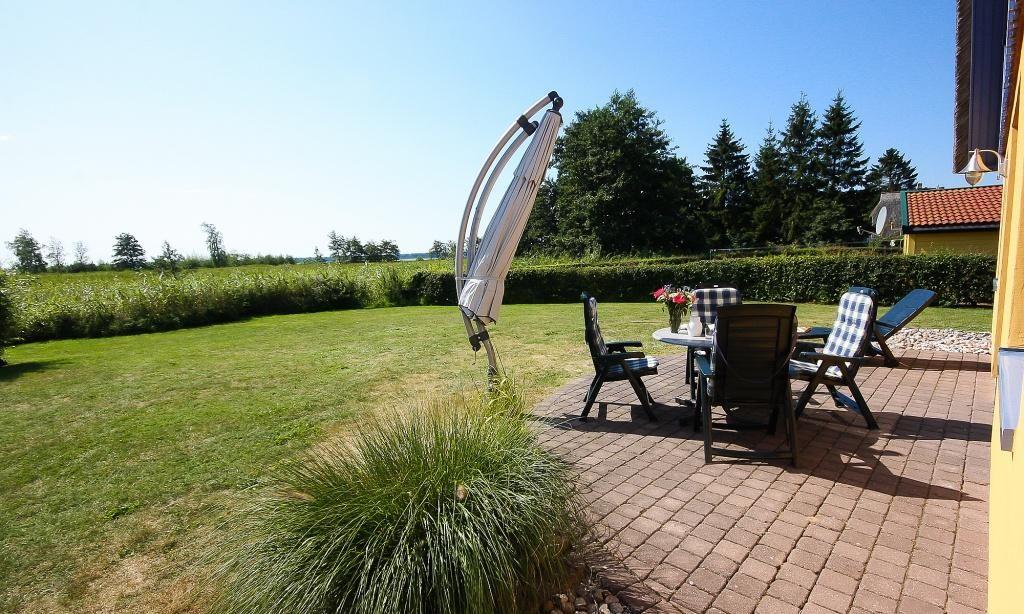 Im Außenbereich erwartet dich eine große Steinterrasse mit herrlichem Blick in den Garten und die angrenzende Boddenlandschaft. Hier kannst du den Tag bei einem sonnigen Frühstück beginnen oder am Abend gemütlich ausklingen lassen. Dank der idyllischen Lage findest du hier die Ruhe und Erholung, die du dir im Urlaub wünschst. Ein abschließbarer Fahrradschuppen und ein PKW-Stellplatz im Carport gehören zur Ferienwohnung dazu.