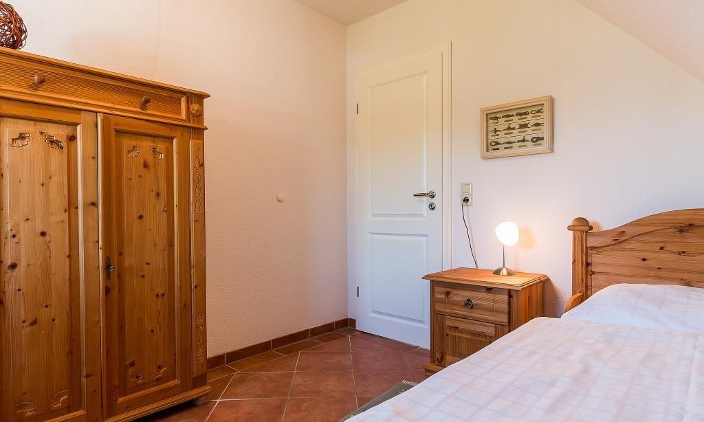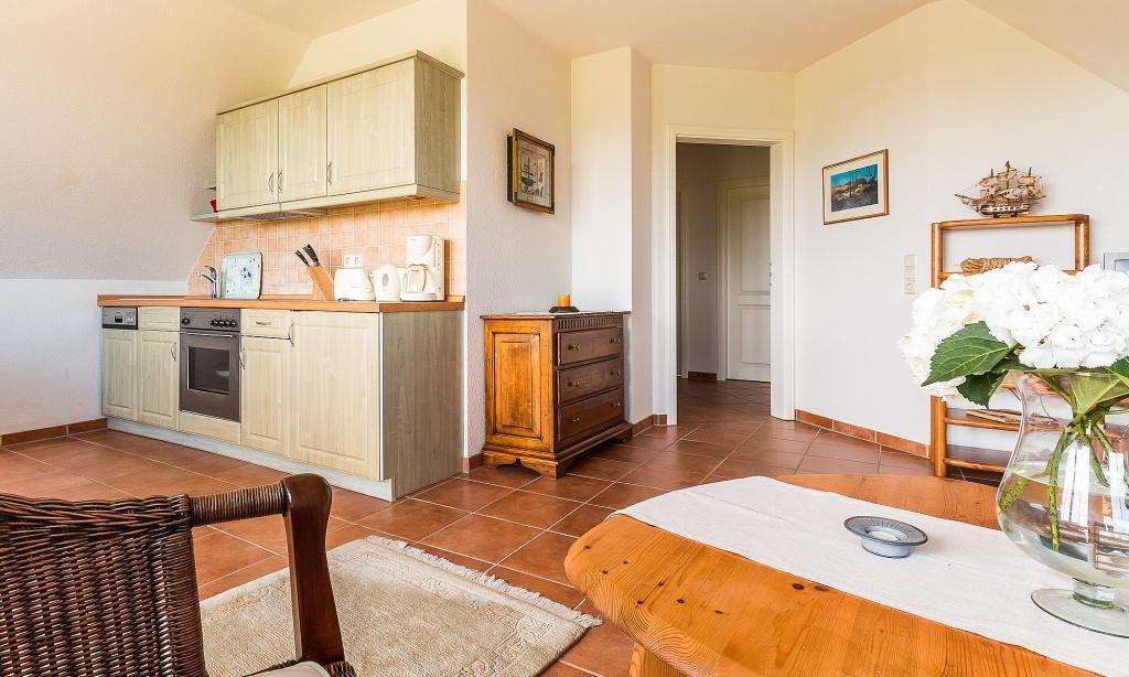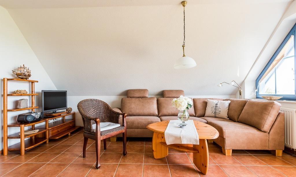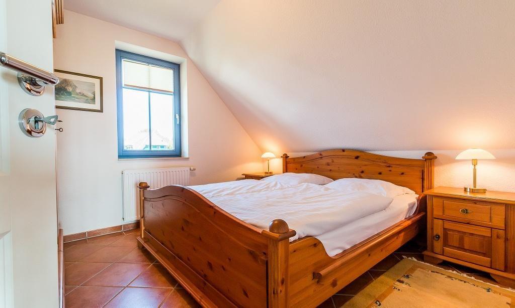 Die Obergeschosswohnung verfügt über einen einladenden Wohnraum mit einer gemütlichen Sitzecke sowie eine Küchenzeile mit angrenzendem Essbereich. Hier genießt du einen traumhaften Blick über den Bodden. Weiterhin gibt es ein Schlafzimmer mit einem Doppelbett, ein Schlafzimmer mit einem Einzelbett sowie ein Bad mit Dusche/WC.