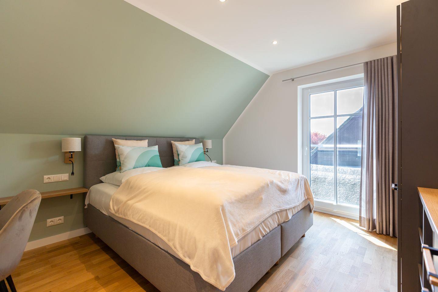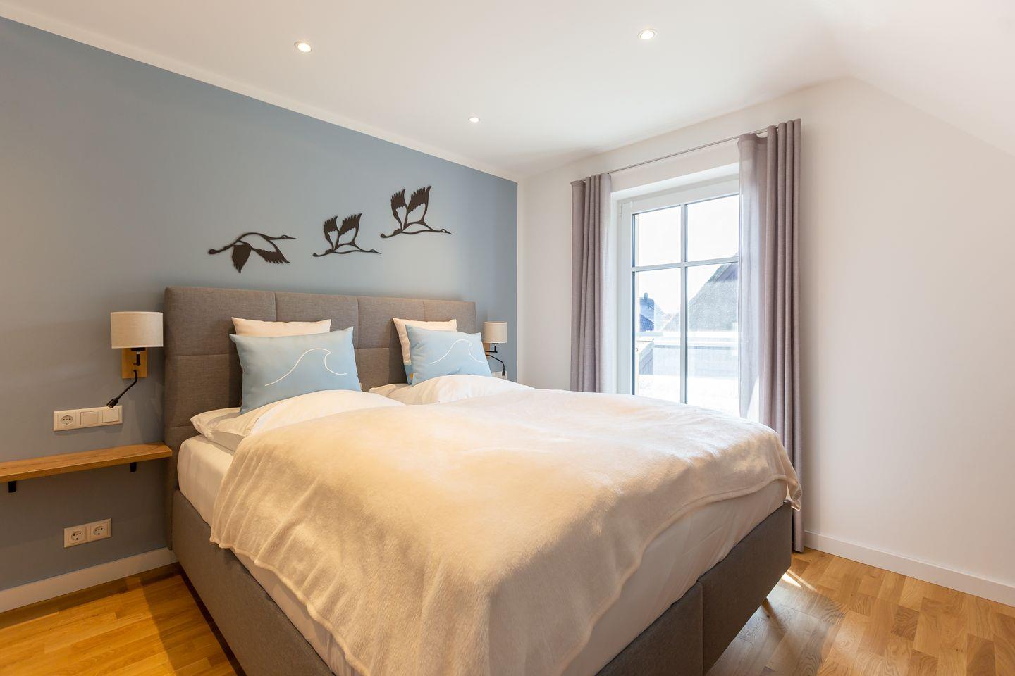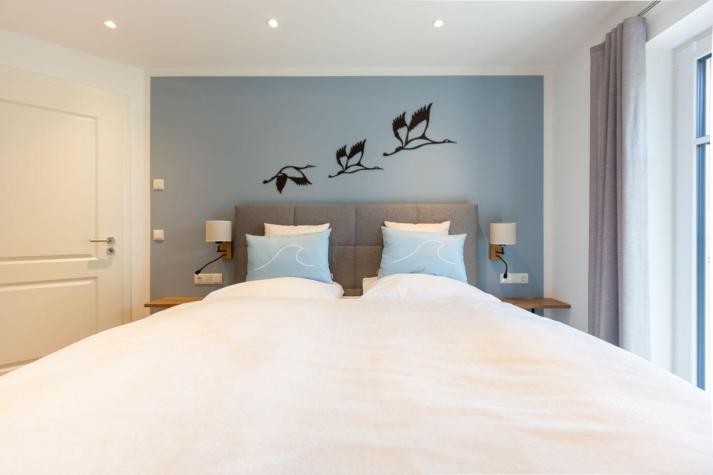 Über die Treppe gelangt man ins Obergeschoss und den Schlafbereich. Beide Schlafzimmer verfügen über ein hochwertiges Boxspringbett, einen Kleiderschrank, Ablagefläche und TV. Unaufgeregte Farben und kleine Akzente, wie die dekorativen Kraniche und Kissen sorgen für Stil und Gemütlichkeit, lenken aber nicht von der erholsamen Ruhezone ab. Ein zweites modernes Tageslichtbad mit Dusche und Badewanne macht den Wohnkomfort perfekt.