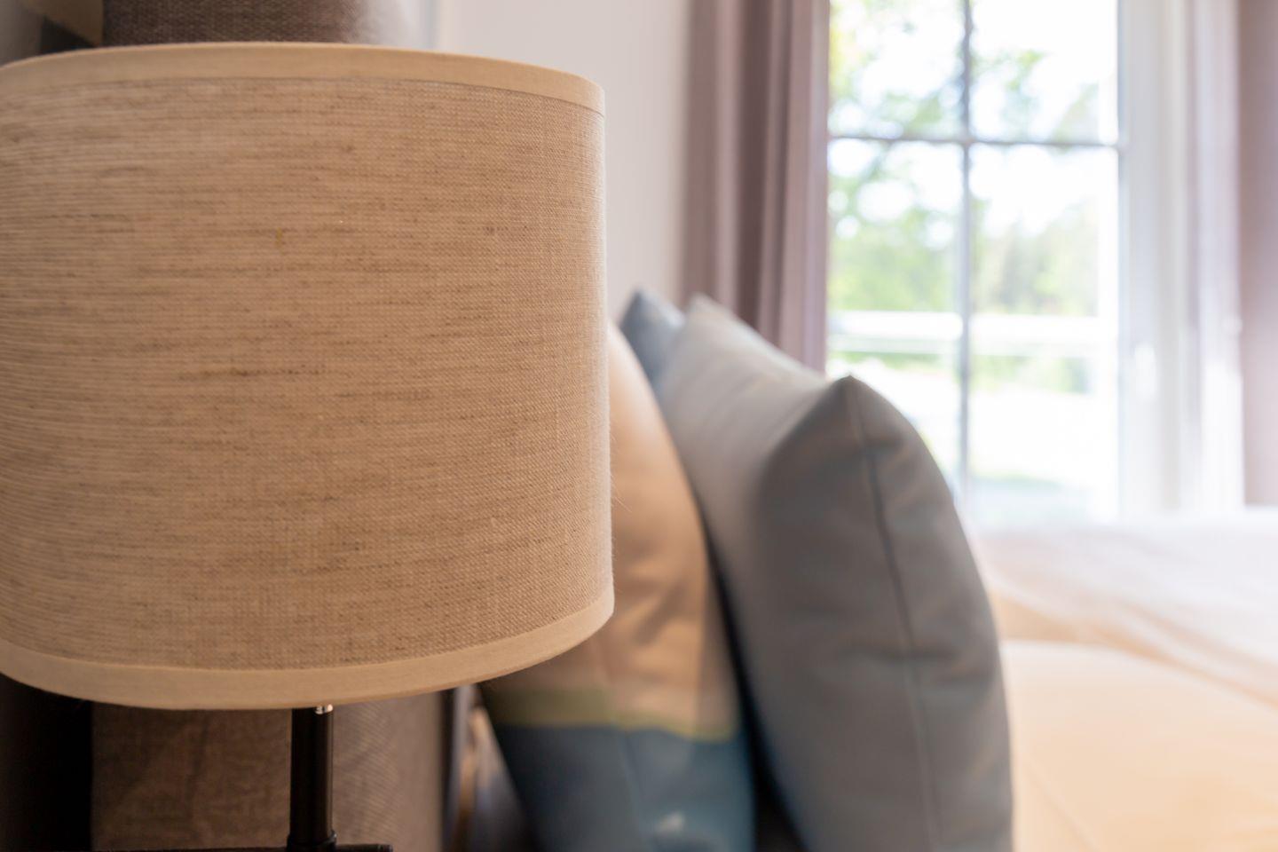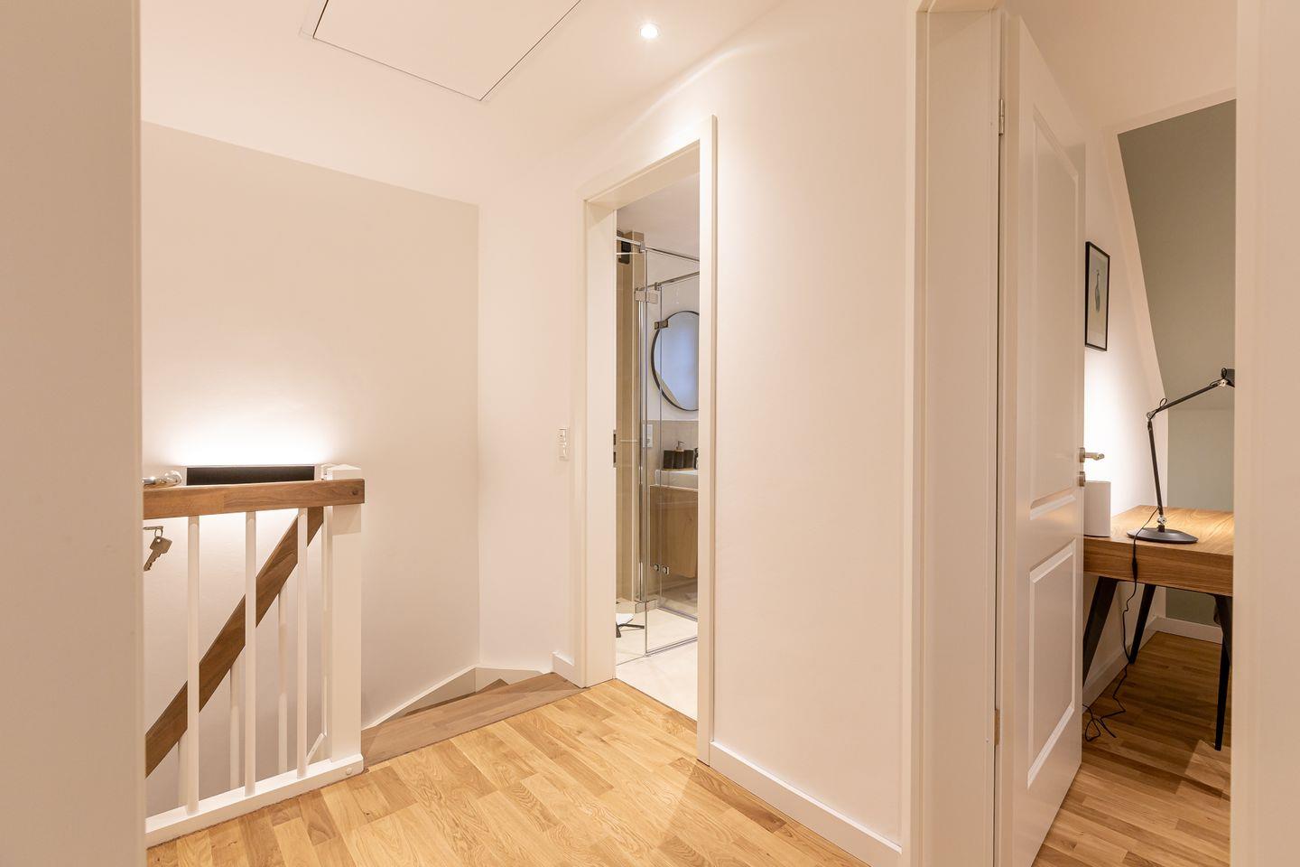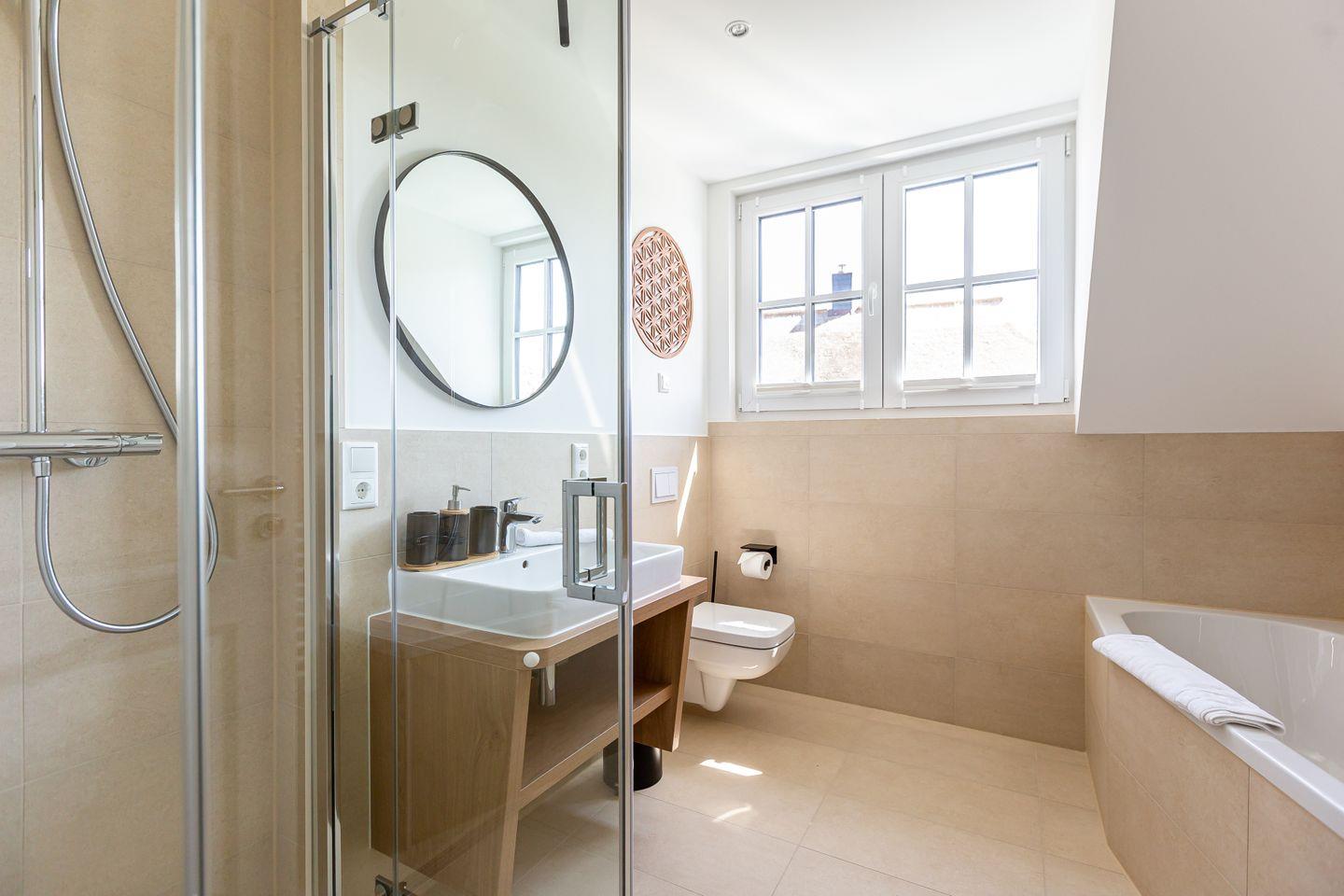 Über die Treppe gelangt man ins Obergeschoss und den Schlafbereich. Beide Schlafzimmer verfügen über ein hochwertiges Boxspringbett, einen Kleiderschrank, Ablagefläche und TV. Unaufgeregte Farben und kleine Akzente, wie die dekorativen Kraniche und Kissen sorgen für Stil und Gemütlichkeit, lenken aber nicht von der erholsamen Ruhezone ab. Ein zweites modernes Tageslichtbad mit Dusche und Badewanne macht den Wohnkomfort perfekt.