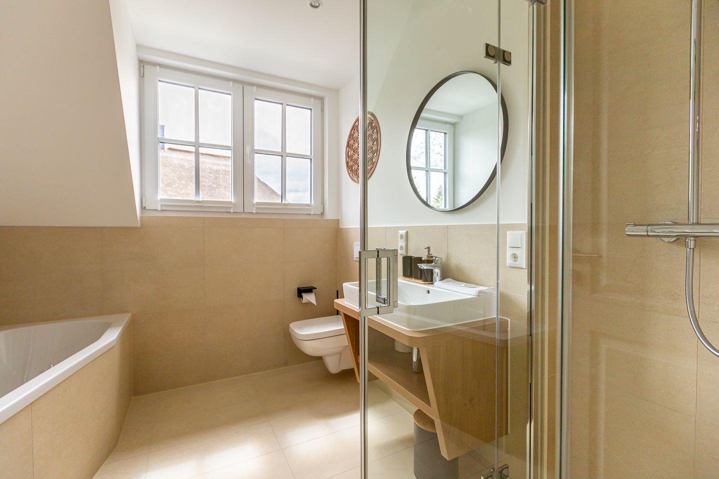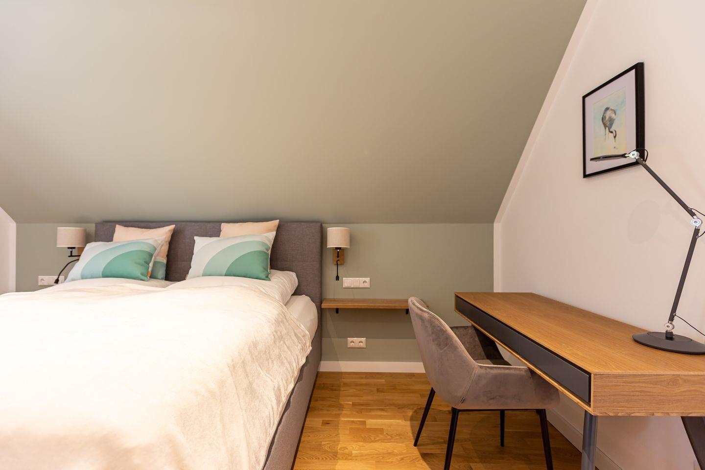 Über die Treppe erreicht man die beiden liebevoll und hochwertig ausgestatteten Schlafzimmer. Großzügige Boxspringbetten, Ablageflächen für Kleidung und stilvolle Beleuchtung sorgen für eine gemütliche Atmosphäre und einen erholsamen Schlaf. Mit einem zweiten Tageslichtbad, dass über eine Dusche und Badewanne verfügt, wird der Wohnkomfort abgerundet.