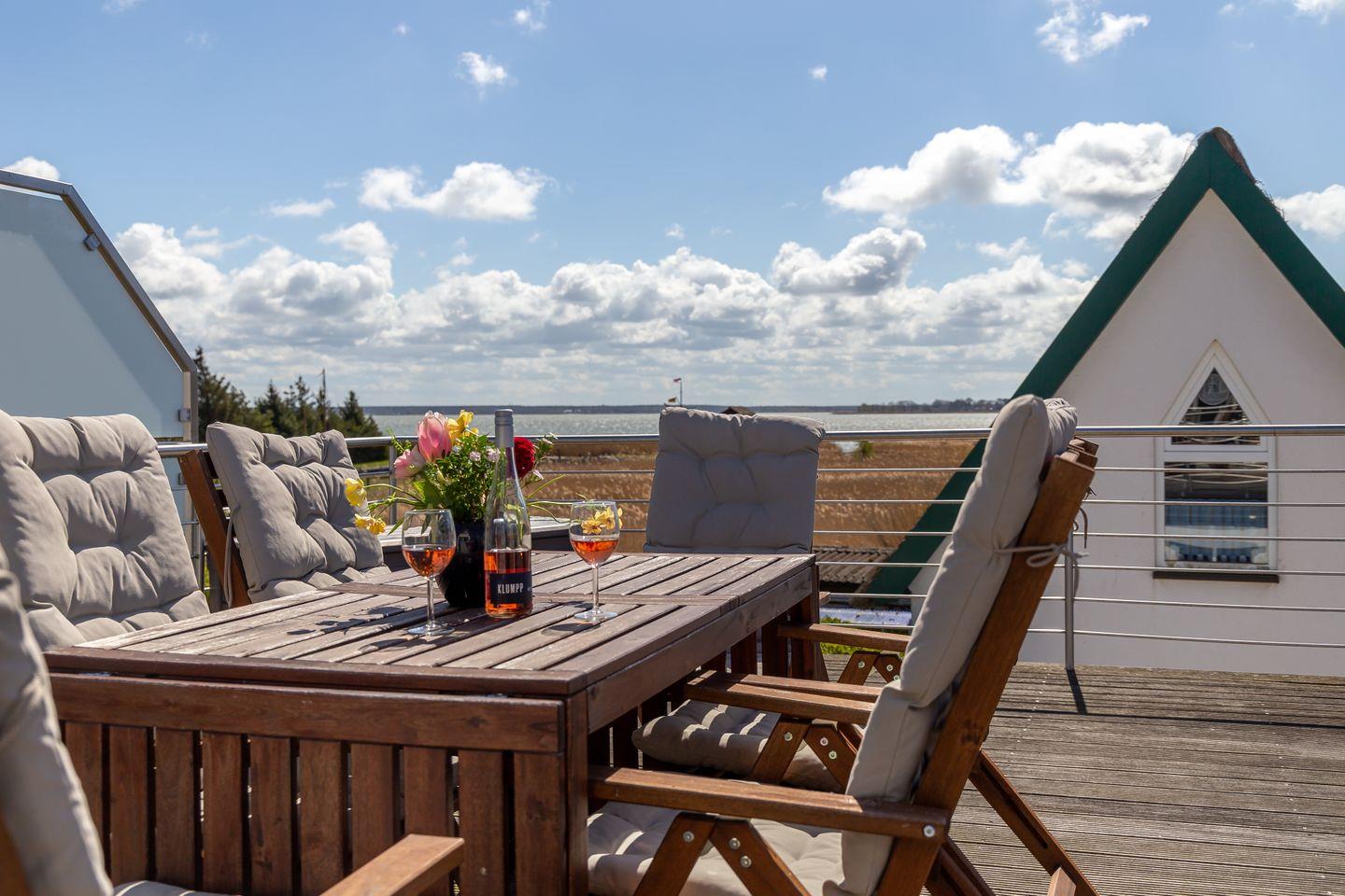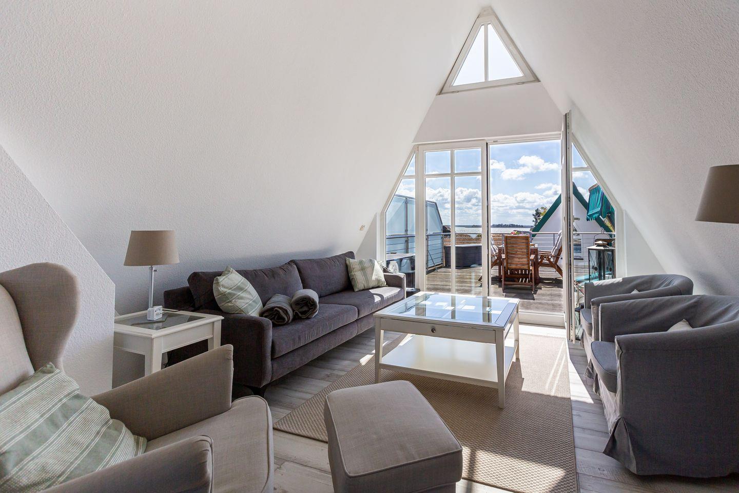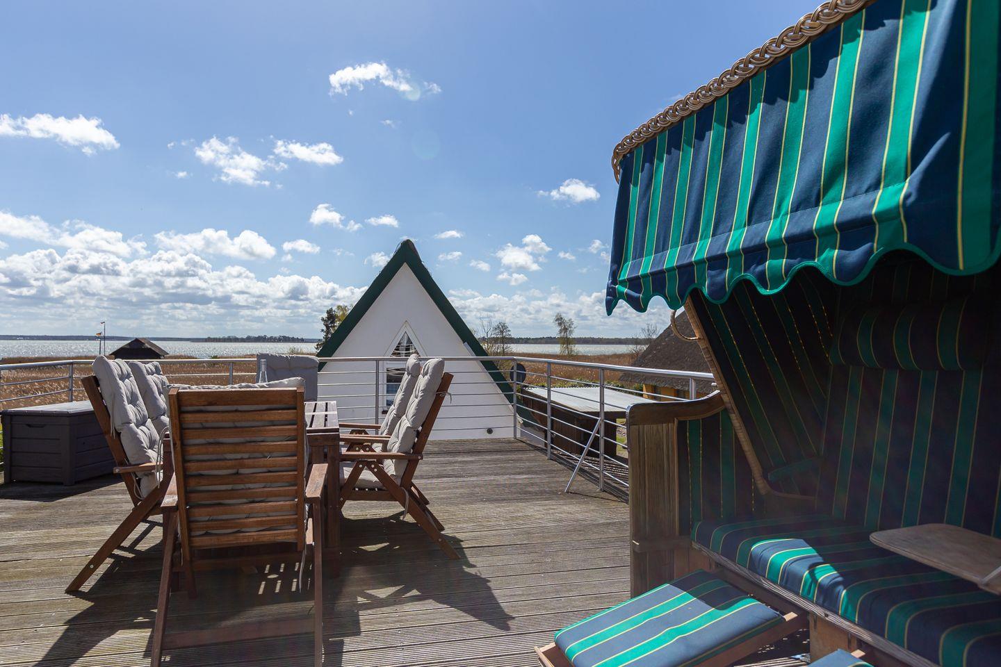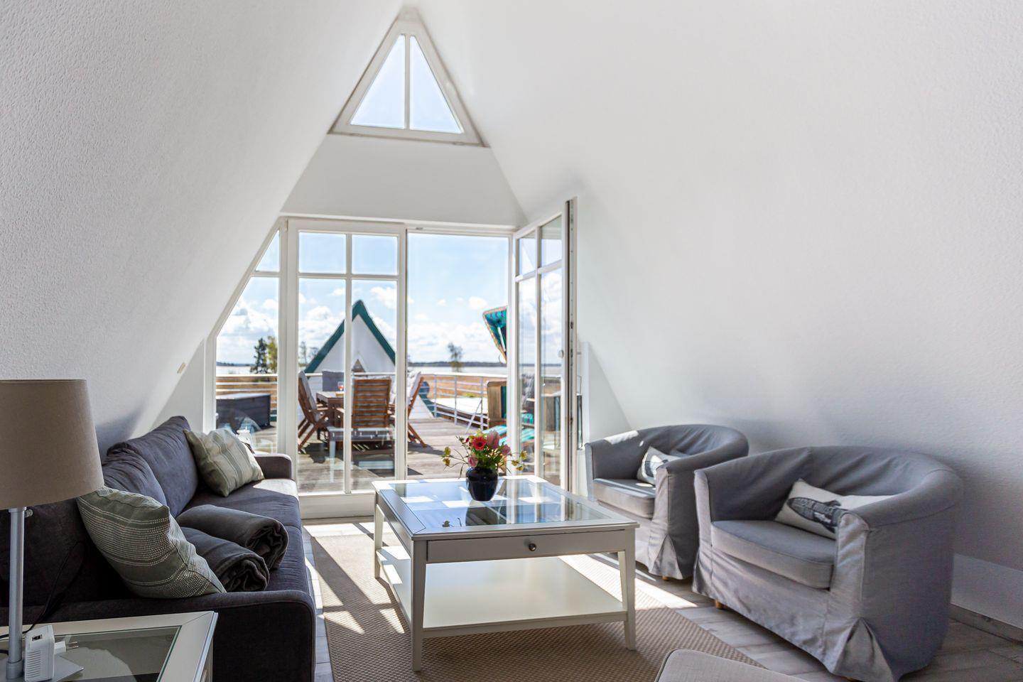 Über die Treppe gelangt man in das Obergeschoss und in das dritte Schlafzimmer. Der Wohnbereich befindet sich im Spitzdach und ist zweifelsohne das Highlight des Ferienhauses. Das lichtdurchflutete und in hellen Farben eingerichtete Wohnzimmer bietet bereits einen spektakulären Blick auf den Bodden. Noch beeindruckender ist dieser auf der angrenzenden Dachterrasse. Egal, ob im Strandkorb oder am großen Tisch – hier möchte man einfach nur sein! Denn nichts lässt einen mehr im Urlaub ankommen, als der weite Blick auf das Wasser, dass in der Sonne glitzert, eingerahmt von einer malerischen Landschaft. Wir übertreiben nicht, wenn wir sagen, dass es nicht viele Ferienhäuser in Wieck mit so einer besonderen Aussicht gibt.