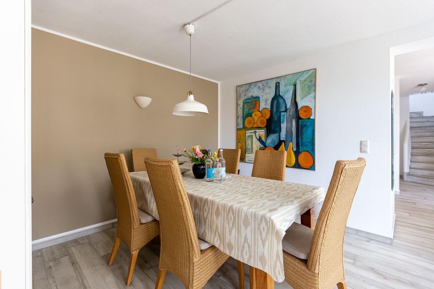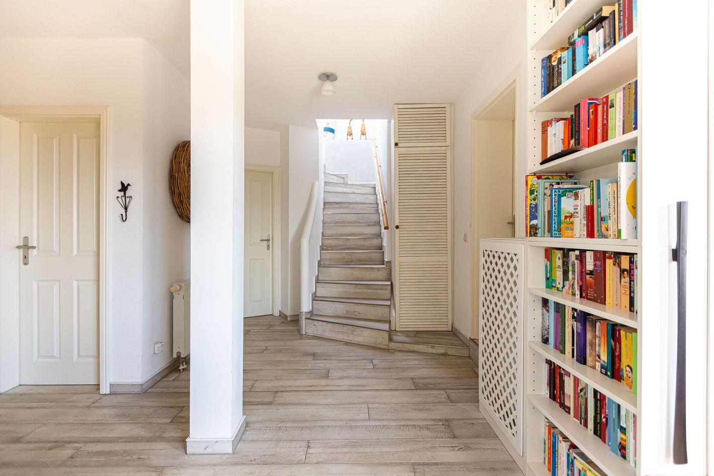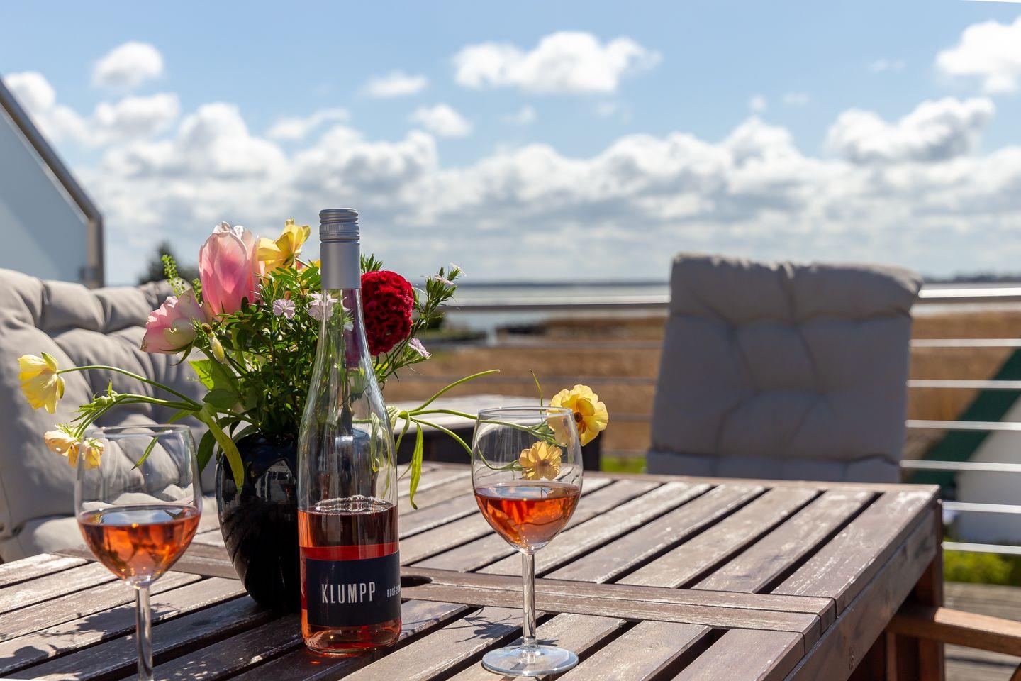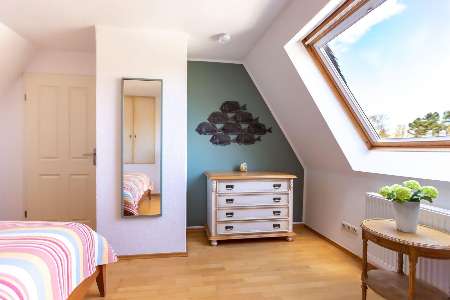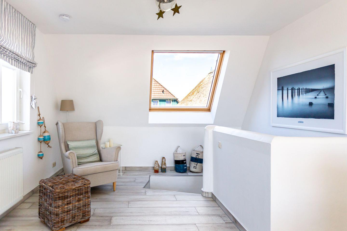 Über die Treppe gelangt man in das Obergeschoss und in das dritte Schlafzimmer. Der Wohnbereich befindet sich im Spitzdach und ist zweifelsohne das Highlight des Ferienhauses. Das lichtdurchflutete und in hellen Farben eingerichtete Wohnzimmer bietet bereits einen spektakulären Blick auf den Bodden. Noch beeindruckender ist dieser auf der angrenzenden Dachterrasse. Egal, ob im Strandkorb oder am großen Tisch – hier möchte man einfach nur sein! Denn nichts lässt einen mehr im Urlaub ankommen, als der weite Blick auf das Wasser, dass in der Sonne glitzert, eingerahmt von einer malerischen Landschaft. Wir übertreiben nicht, wenn wir sagen, dass es nicht viele Ferienhäuser in Wieck mit so einer besonderen Aussicht gibt.