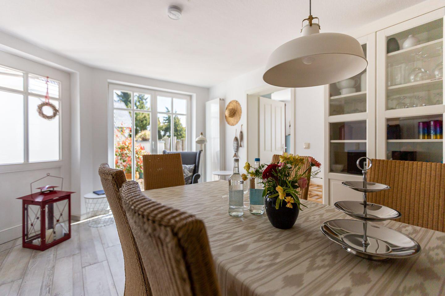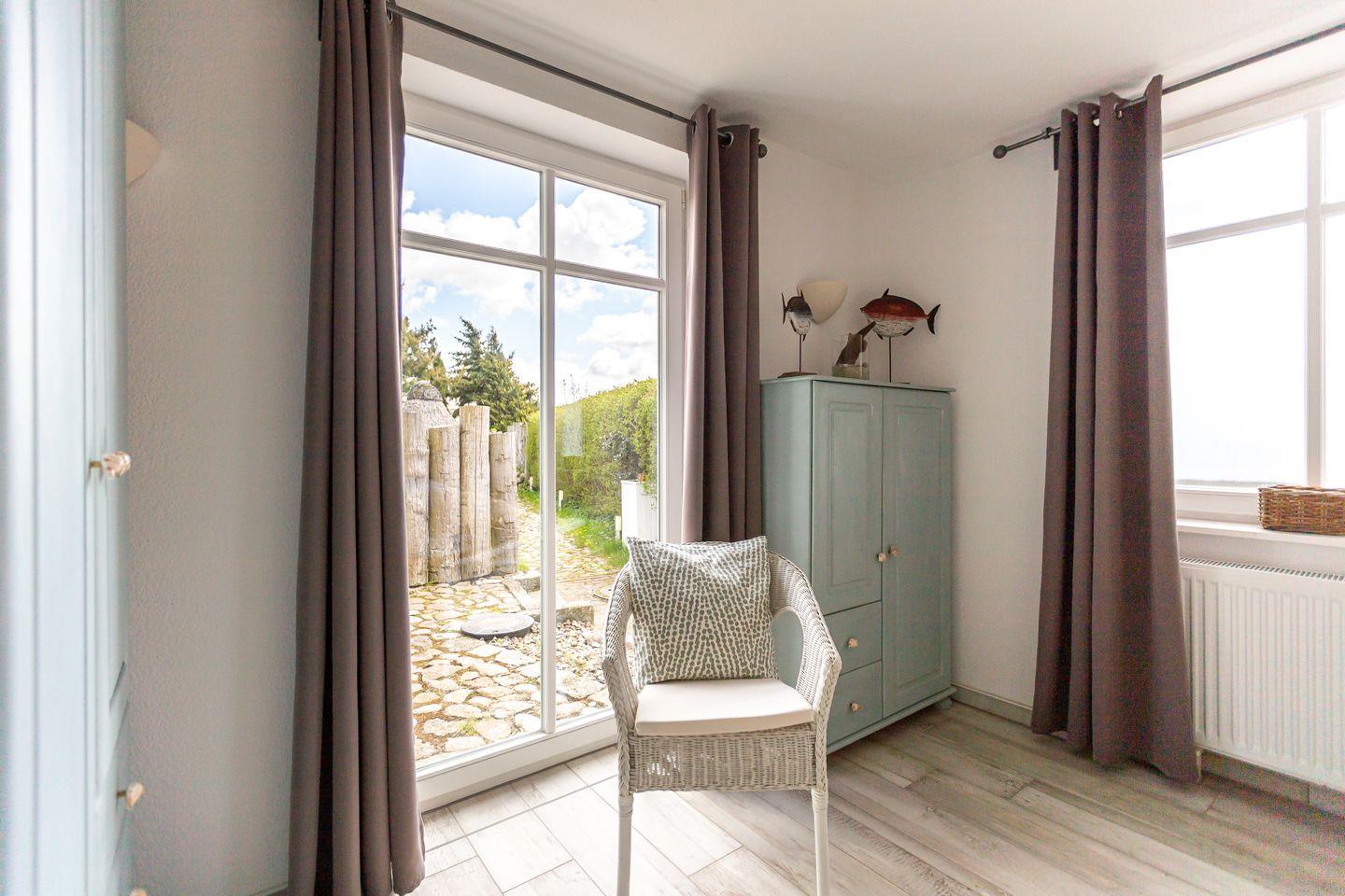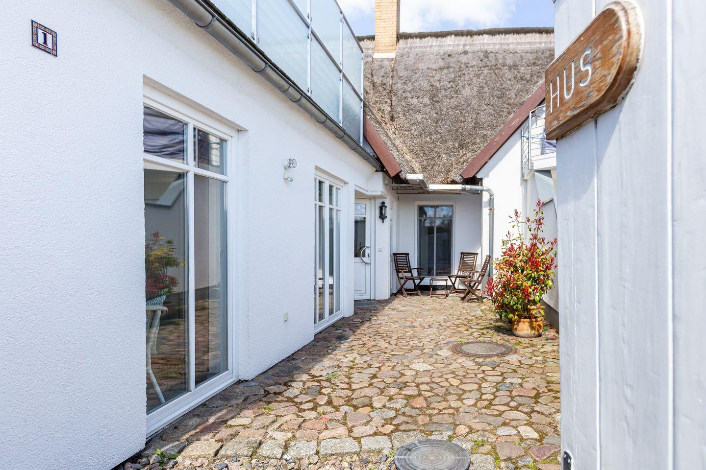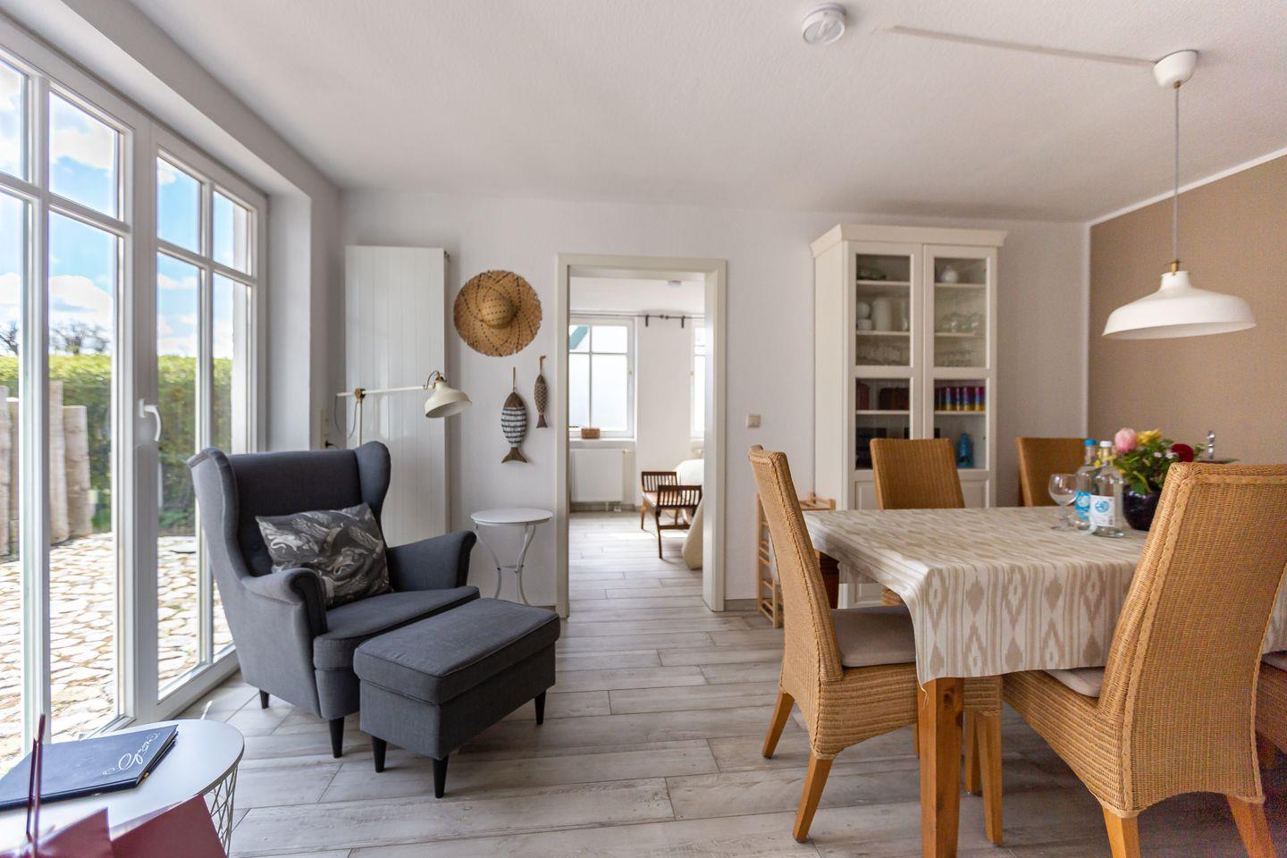 Die großzügige Doppelhaushälfte gehört zu den darßtypischen Reetdachhäusern, die so bekannt und beliebt für die Halbinsel sind. Schon bei Eintritt durch das große Holztor und den sonnigen Innenhof mit seinem alten Kopfsteinpflaster bekommt man Lust auf Urlaub. Im Erdgeschoss befindet sich die vollausgestattete Küche mit separatem Esszimmer. Der sonnige Platz an bodentiefen Fenstern biete sich bestens an, um gemeinsam zu essen, zu klönen und für ein gemütliches Beisammensein. Auch zwei der drei Schlafzimmer befinden sich hier. Eins verfügt über ein großes gemütliches Doppelbett, das andere über ein Etagenbett. Mit Kleiderschrank und Vorhängen bieten sie nicht nur Komfort, sondern auch einen heimeligen Rückzugsort. Abgerundet wird das Untergeschoss mit einem Gäste-WC und dem Tageslichtbad mit großer Regendusche.