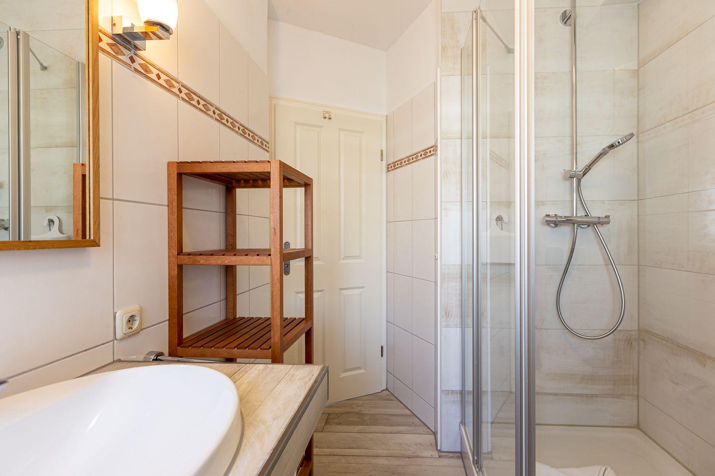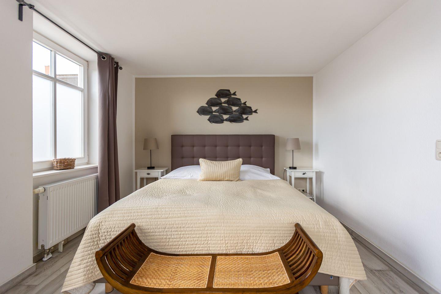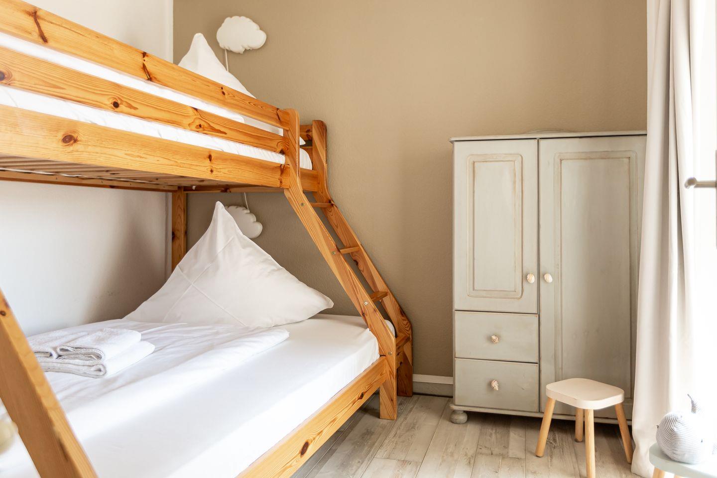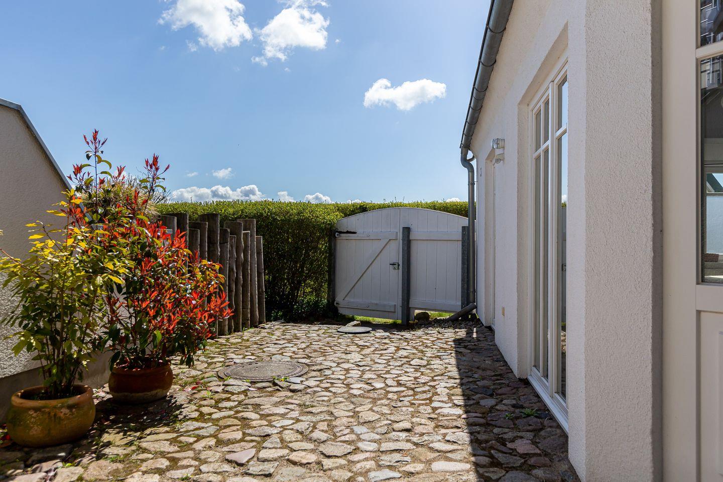Die großzügige Doppelhaushälfte gehört zu den darßtypischen Reetdachhäusern, die so bekannt und beliebt für die Halbinsel sind. Schon bei Eintritt durch das große Holztor und den sonnigen Innenhof mit seinem alten Kopfsteinpflaster bekommt man Lust auf Urlaub. Im Erdgeschoss befindet sich die vollausgestattete Küche mit separatem Esszimmer. Der sonnige Platz an bodentiefen Fenstern biete sich bestens an, um gemeinsam zu essen, zu klönen und für ein gemütliches Beisammensein. Auch zwei der drei Schlafzimmer befinden sich hier. Eins verfügt über ein großes gemütliches Doppelbett, das andere über ein Etagenbett. Mit Kleiderschrank und Vorhängen bieten sie nicht nur Komfort, sondern auch einen heimeligen Rückzugsort. Abgerundet wird das Untergeschoss mit einem Gäste-WC und dem Tageslichtbad mit großer Regendusche.