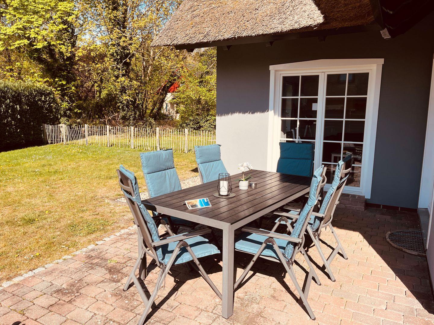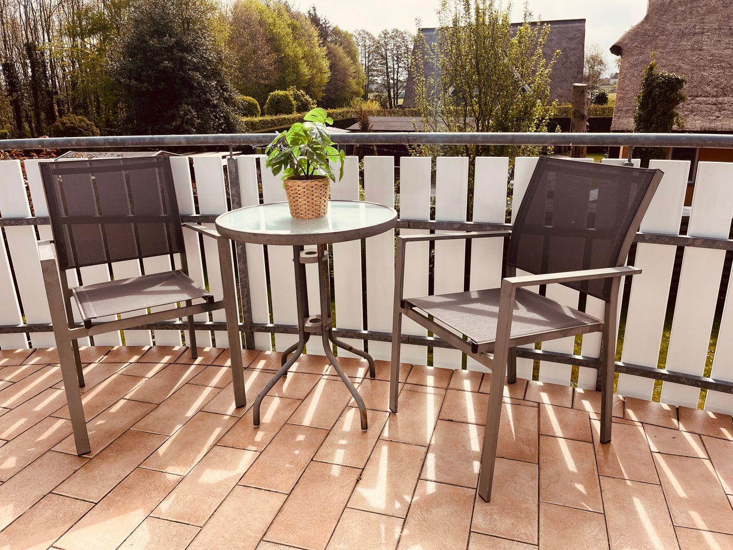 bietet mit Blick in den Garten, tolle Erholung. Kinderbett und Hochstuhl stehen