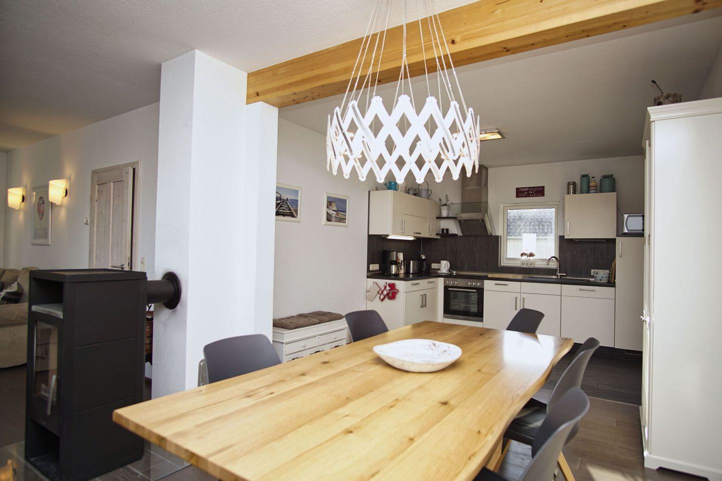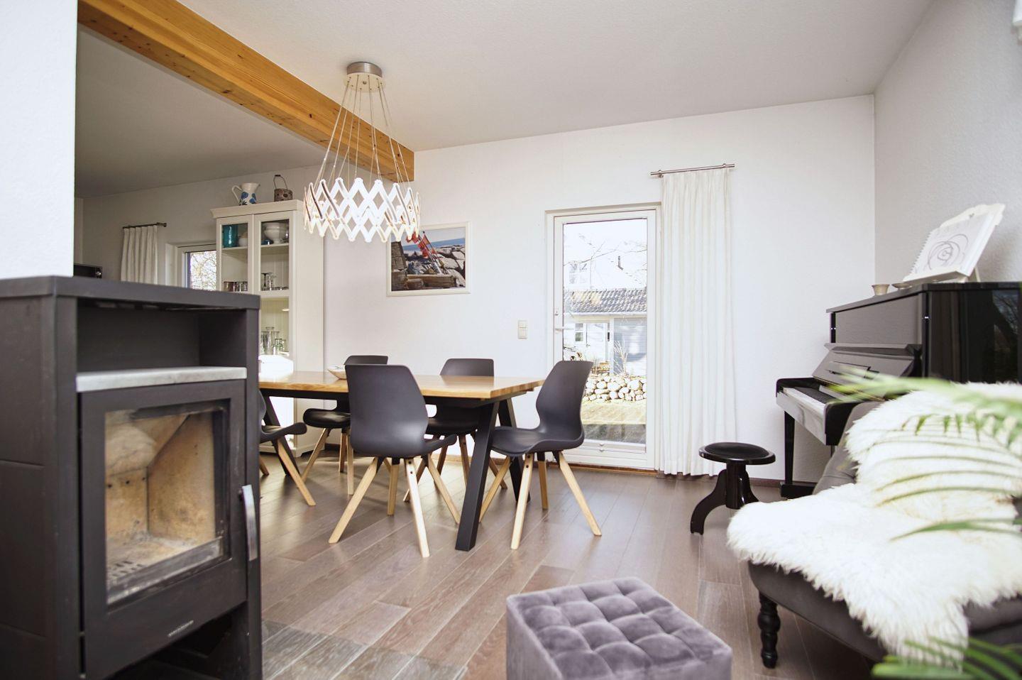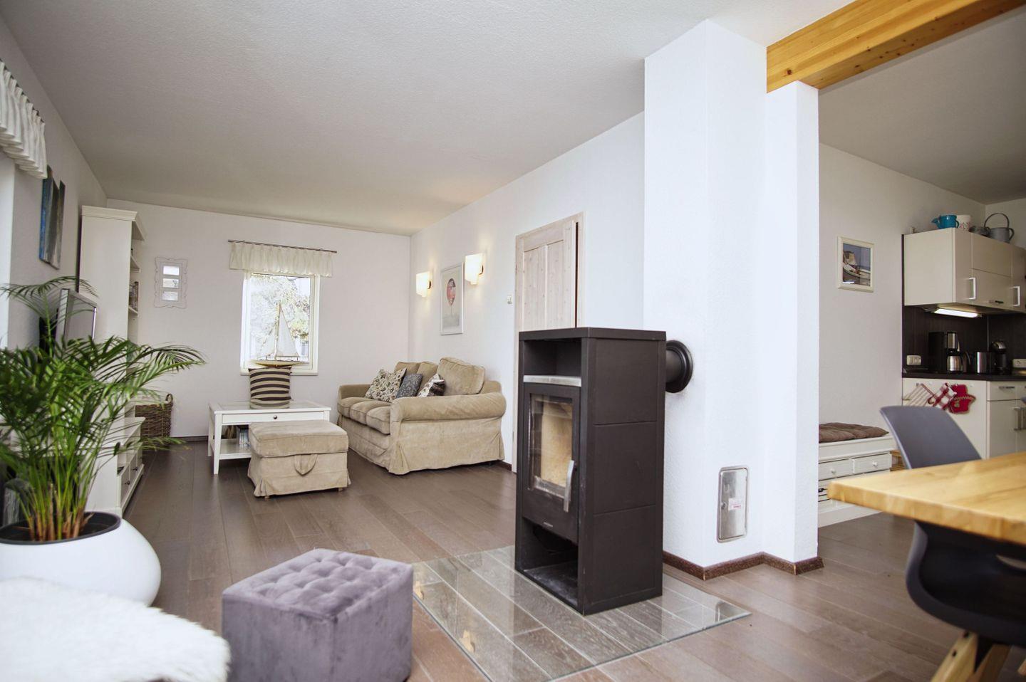 WOHNEN // Wohnraum mit Essbereich, Sitzgarnitur mit bequemer Couch, Kaminofen, Flachbild-TV, CD + DVD-Player ++