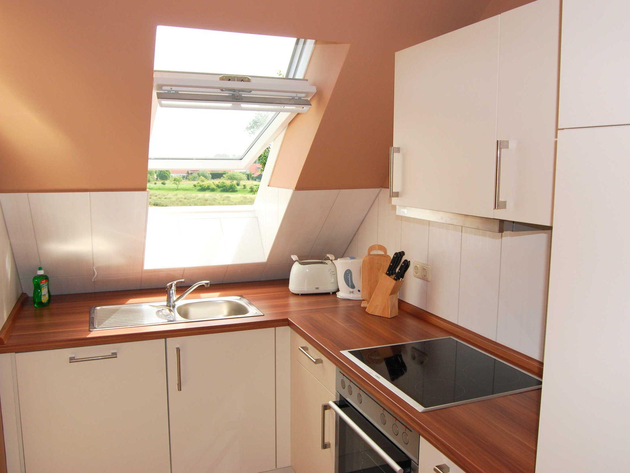 Das Bad hat eine ebenerdige Dusche und ein Fenster mit Blick ins Grüne (siehe Beispielbild bei den Außenansichten). Die separate Küche hat ebenfalls ein großes Fenster mit Blick ins Grüne. Die Ferienwohnungen 1 und 3 sind barrierefrei und rollstuhlgerecht.
