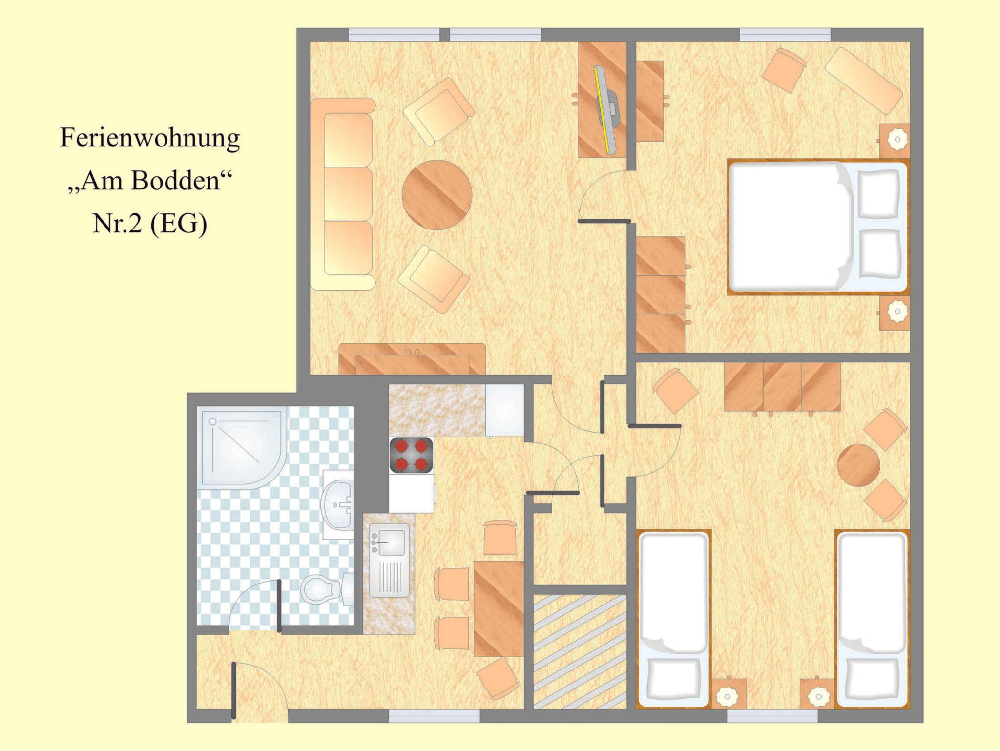 Die Ferienwohnungen 'Am Bodden' bestehen jeweils aus einem Wohnraum mit Sitzecke und Sat-TV, 2 separaten Schlafzimmern (1x Doppelbett, 1x 2 Einzelbetten) und einem Bad mit Dusche, Waschbecken & WC.