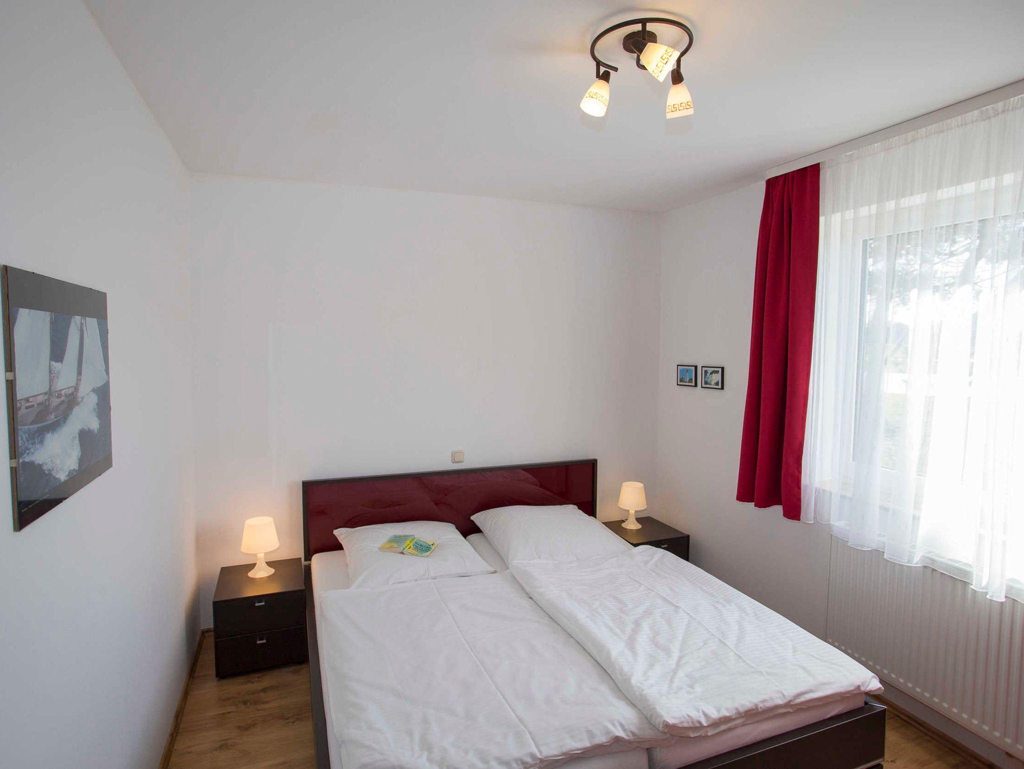 Der Wohnraum ist geschmackvoll eingerichtet und verfügt über einen Flachbild-TV, einem Lowboard sowie einer ausziehbaren schwarzen Ledercouch und einem großen massiven Holzesstisch mit 6 Stühlen. Vom Wohnraum ist der Zugang zur großen Terrasse gegeben. Die Ferienwohnung verfügt über zwei separate Schlafzimmer mit jeweils einem Doppelbett (2,00 x 1,80m, einzelnen 21cm dicken Komfort-Kaltschaum-Matratzen sowie sehr guten Lattenrosten) und jeweils einen großen Kleiderschrank.