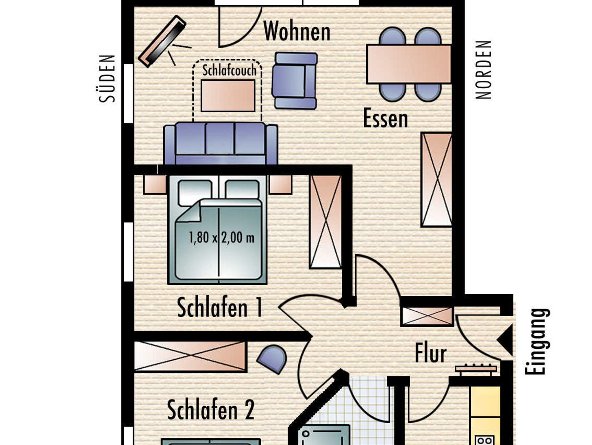 Die modern, hell und individuell eingerichtete 3-Raum Ferienwohnung in Wiek auf der Insel Rügen befindet sich im Erdgeschoss im Haus Boddenblick. Sie hat eine Grundfläche von ca. 63qm.