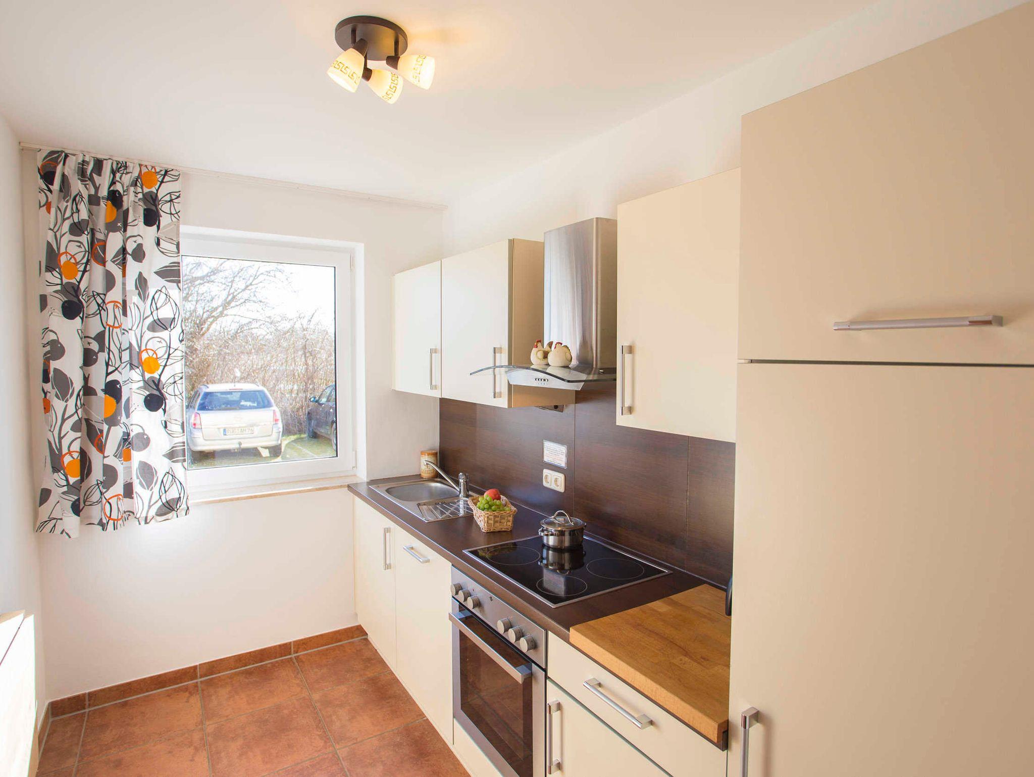 Die Küche ist mit AEG-Geräten ausgestattet: Geschirrspüler, Backofen, 4-Platten-Ceranfeld. Der große Kühlschrank mit Gefrierfach ist von Privileg. Die Küche ist weiterhin mit Toaster, Kaffeemaschine, Wasserkocher, Messerblock, Töpfe, Pfanne sowie ausreichend Geschirr und Besteck ausgestattet.