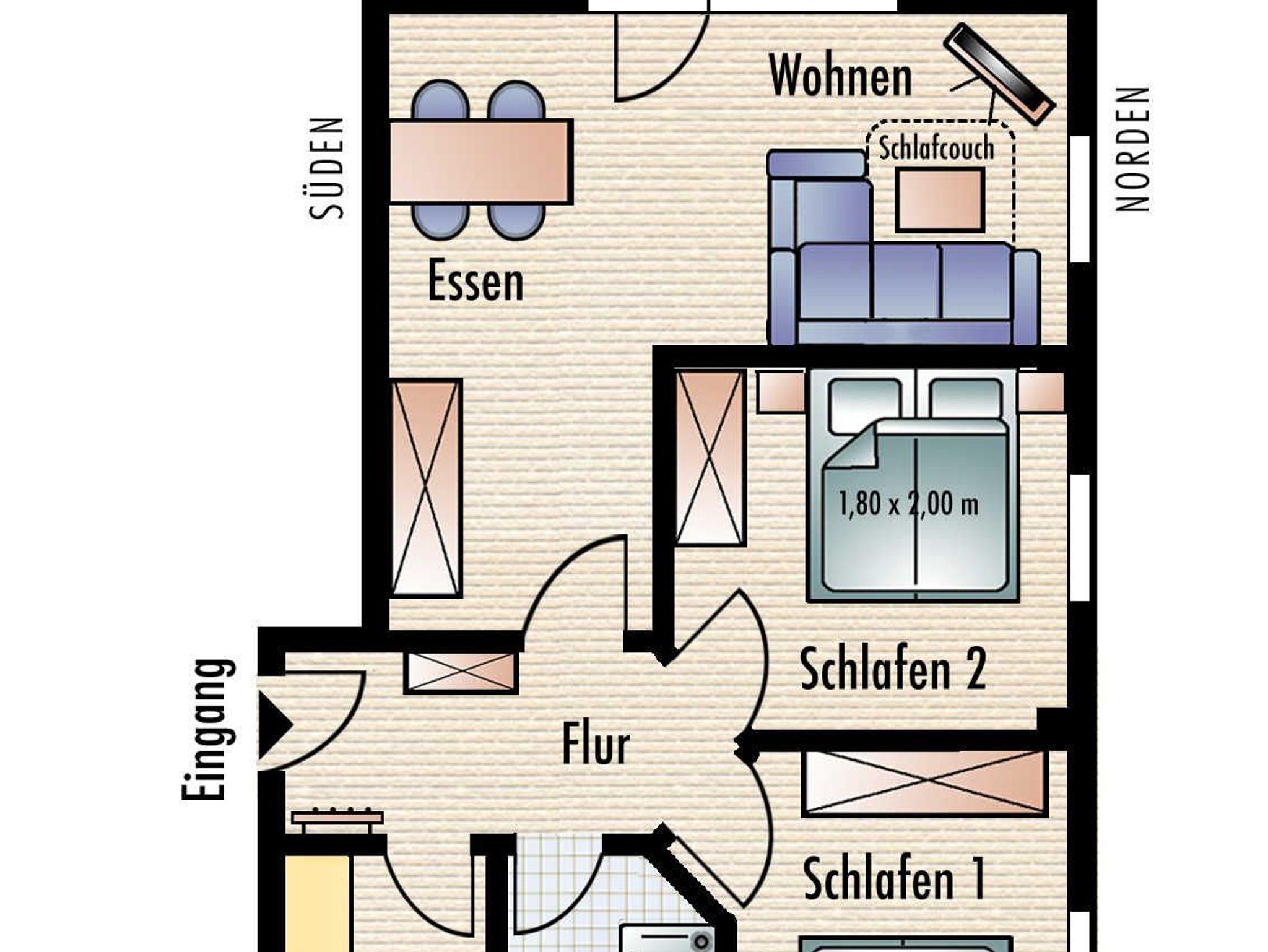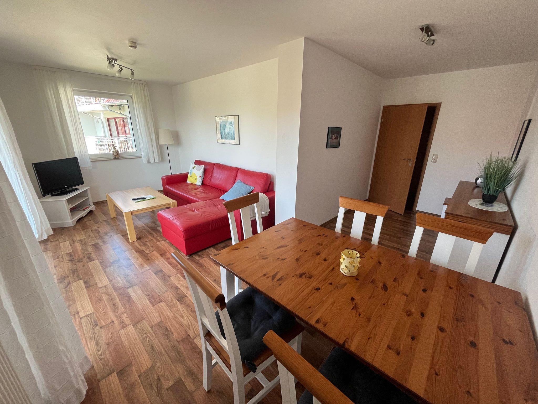 Der Wohnraum ist geschmackvoll eingerichtet und verfügt über einen Flachbild-TV, einem Lowboard sowie einer ausziehbaren roten Couch und einem großen massiven Holzesstisch mit 6 Stühlen. Vom Wohnraum ist der Zugang zur großen Terrasse gegeben. Die Ferienwohnung verfügt über zwei separate Schlafzimmer mit jeweils einem Doppelbett (2,00 x 1,80m, einzelnen 21cm dicken Komfort-Kaltschaum-Matratzen sowie sehr guten Lattenrosten) und jeweils einen großen Kleiderschrank.