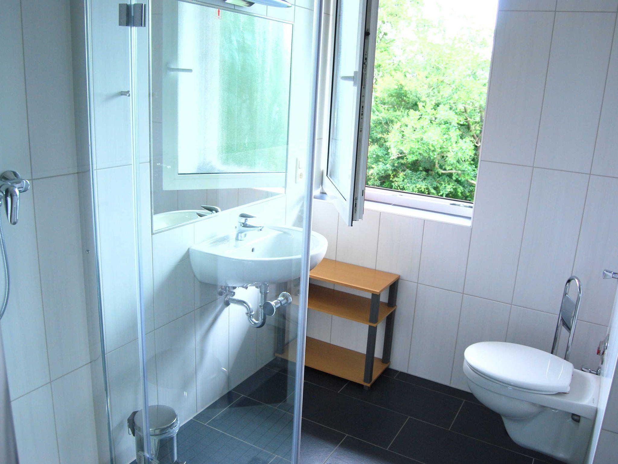 Das Bad verfügt über ein Fenster. Es ist mit einer ebenerdigen Glasdusche, WC, Wasch-becken und einem großen Spiegel ausgestattet.