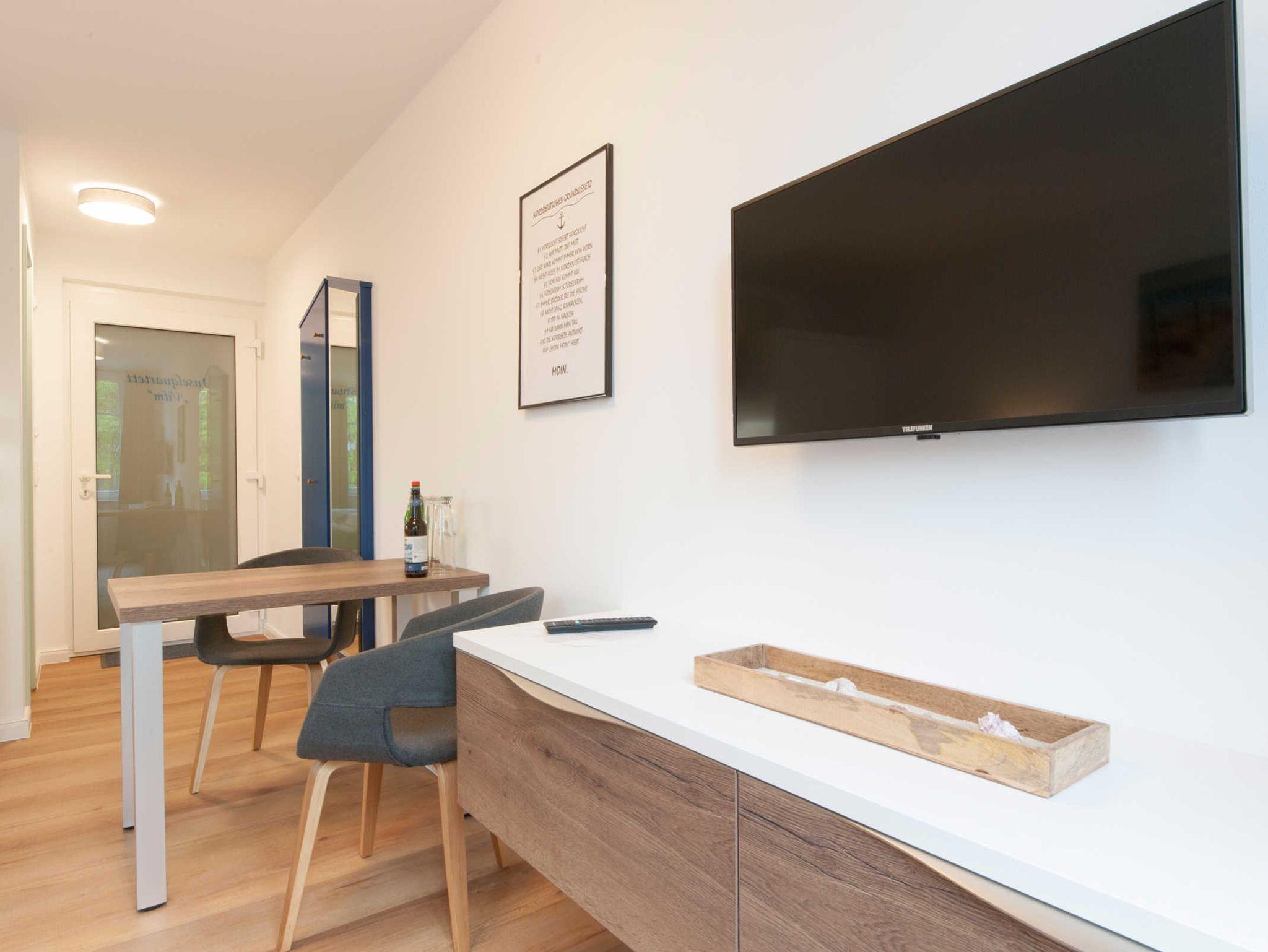 Die Küche verfügt über ein 2-fach Ceranfeld, Mikrowelle oder Backofen, Kühlschrank mit kleiner Gefriermöglichkeit, Kaffeemaschine oder Kaffeepresse, Toaster und Wasserkocher. Das Bad ist mit Dusche ausgestattet. Die Appartements haben selbstverständlich kostenlos WLAN/Internet, ein SMART-TV, sodass Mediatheken/youtube geschaut werden können und mit einer Spielesammlung kann man den Abend gemütlich ausklingen lassen.