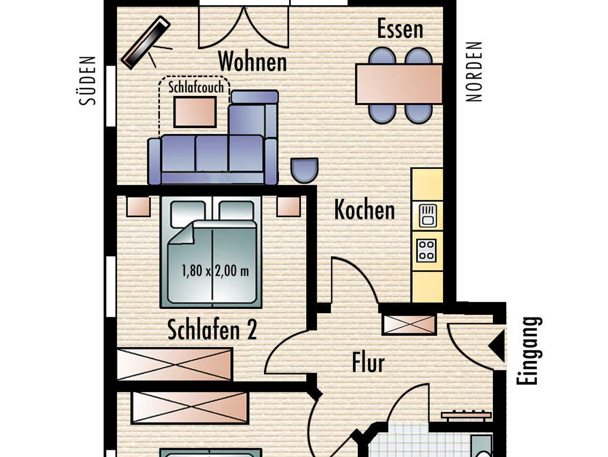 Die Ferienwohnung verfügt über zwei separate Schlafzimmer mit jeweils einem Doppelbett (2,00 x 1,80m, einzelnen 21cm dicken Komfort-Kaltschaum-Matratzen sowie sehr guten Lattenrosten) und jeweils einen großen Kleiderschrank.