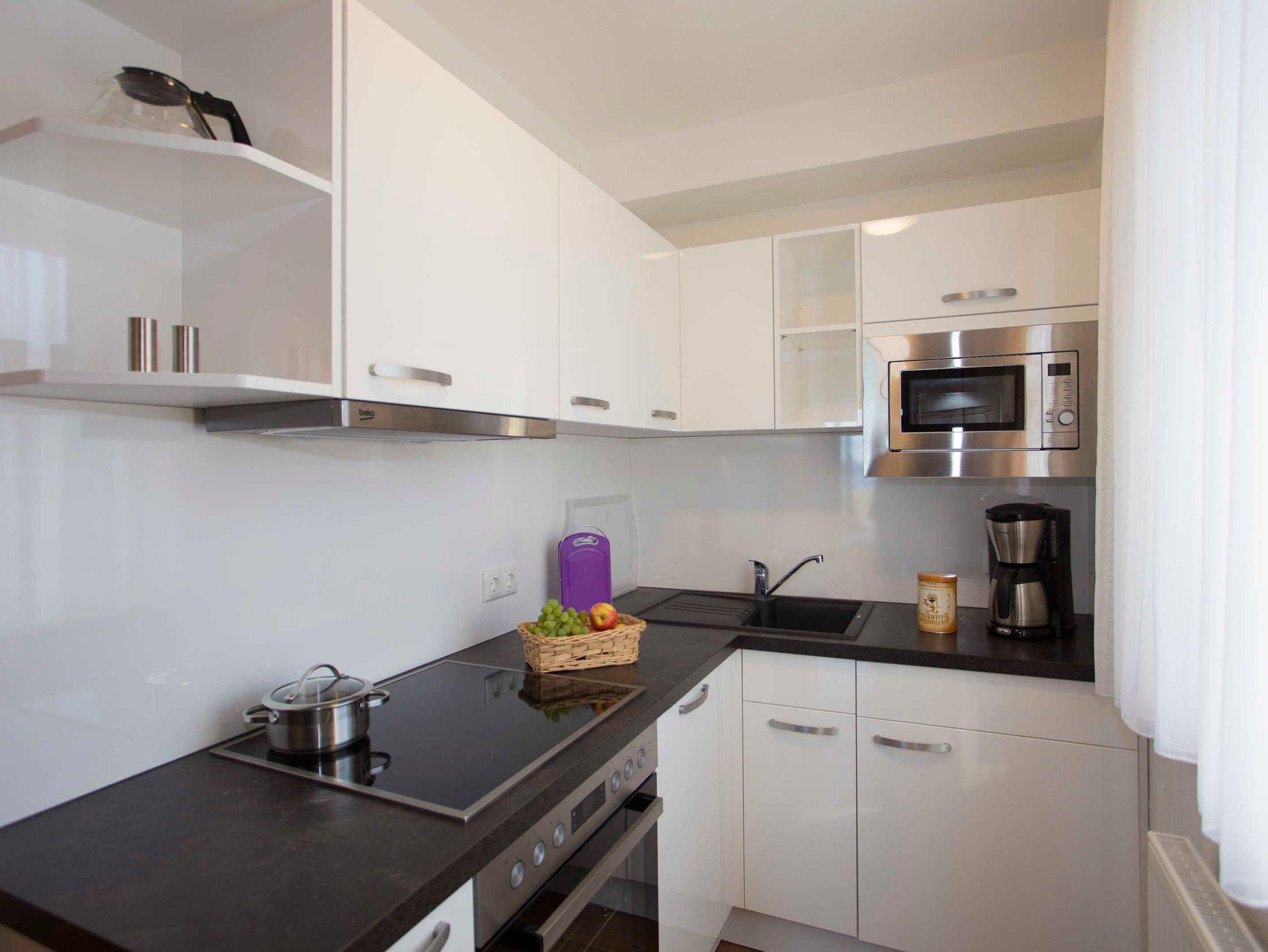 In der kleinen separaten Küche mit Fenster befindet sich ein Kühlschrank mit Gefrierfach, Toaster, Kaffeemaschine, Wasserkocher, 2-Platten-Kochfeld, Mikrowelle mit Grill, Töpfe, Pfanne sowie ausreichend Geschirr und Besteck.