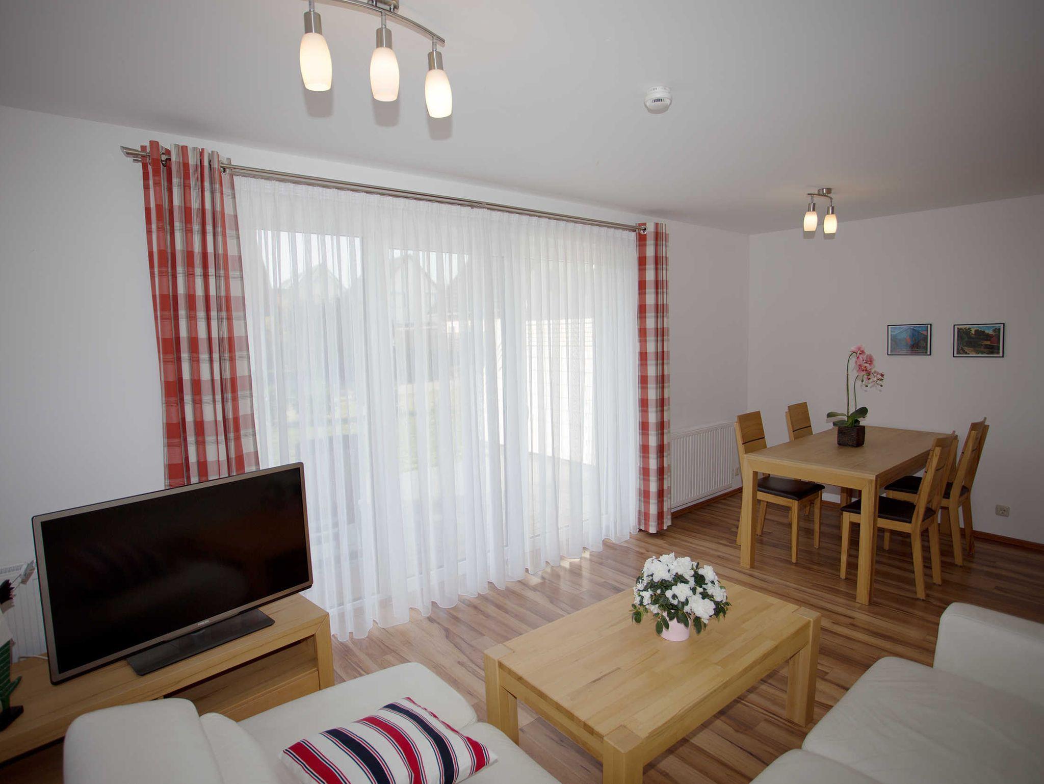 Der Wohnraum ist geschmackvoll eingerichtet und verfügt über einen Flachbild-TV, einem Lowboard sowie einer ausziehbaren Couch und einem großen massiven Holzesstisch mit 6 Stühlen. Vom Wohnraum ist der Zugang zur großen Terrasse gegeben.
