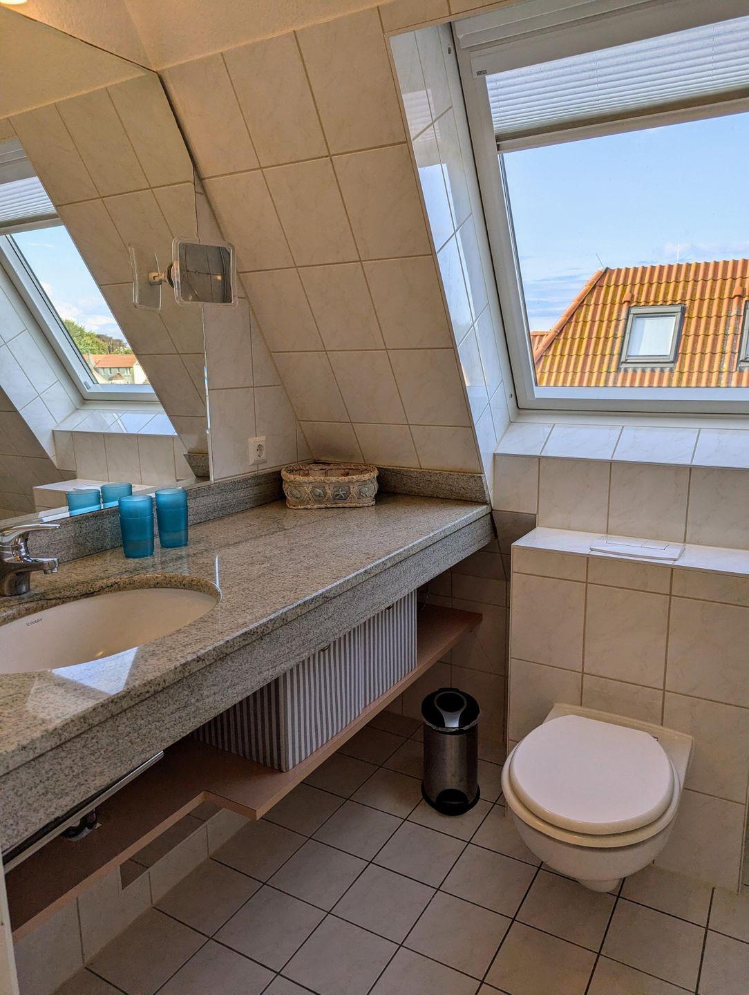 In der oberen Ebene befinden sich zwei Schlafräume mit Verdunklungsmöglichkeit und das Badezimmer mit großem Fenster.