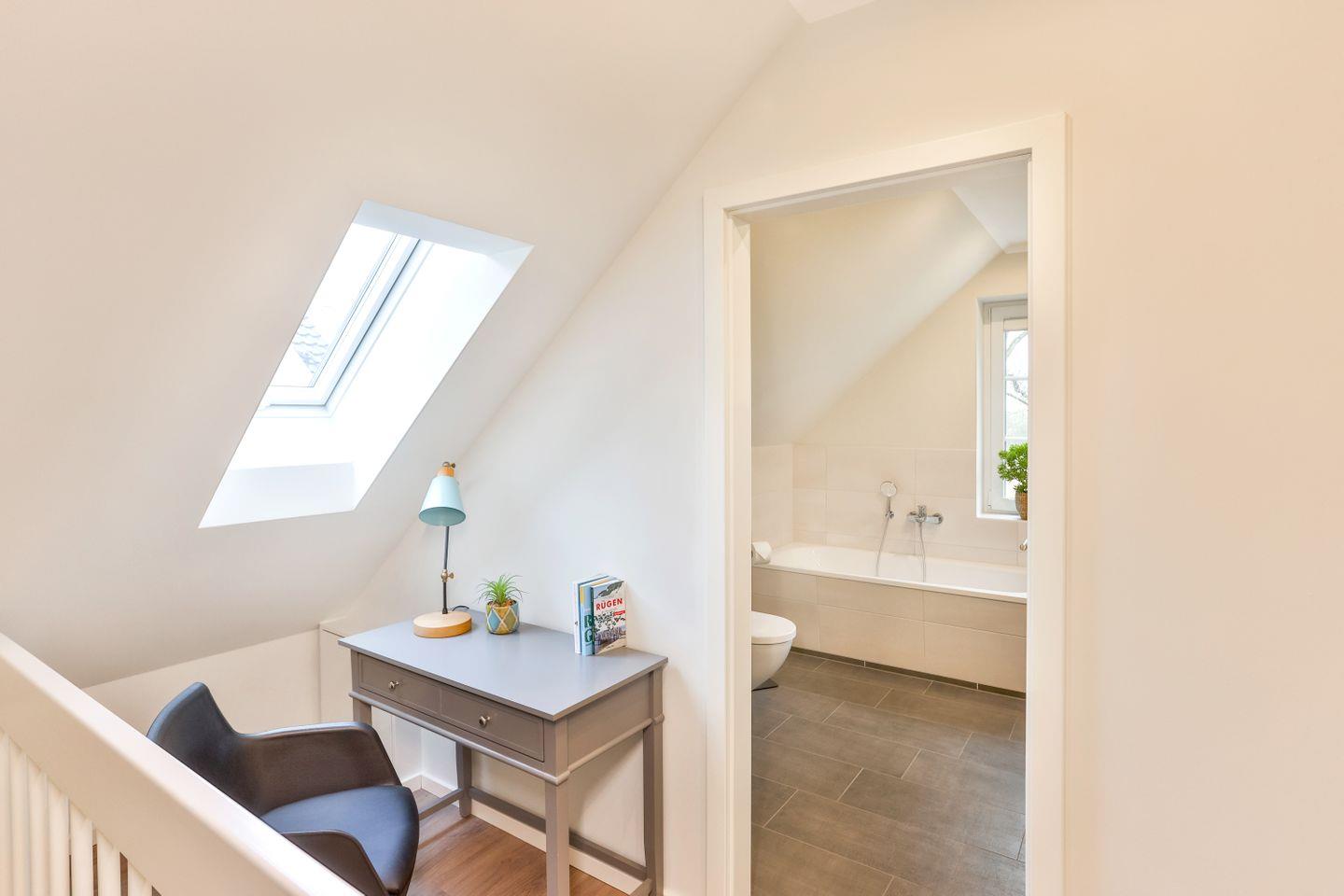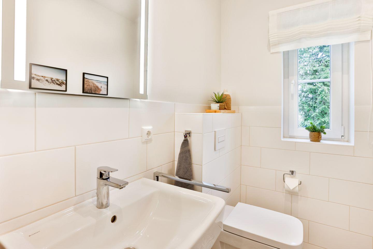 Das große Bad mit Wanne & Dusche oben, zusätzliches WC unten. Ein Hauswirtschaftsraum mit Waschmaschine, Bügeleisen & Reinigungsutensilien steht zur Verfügung.