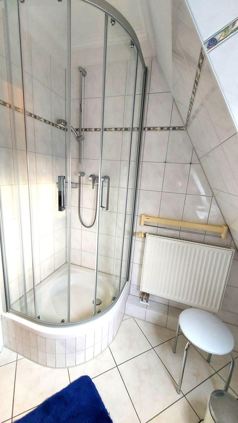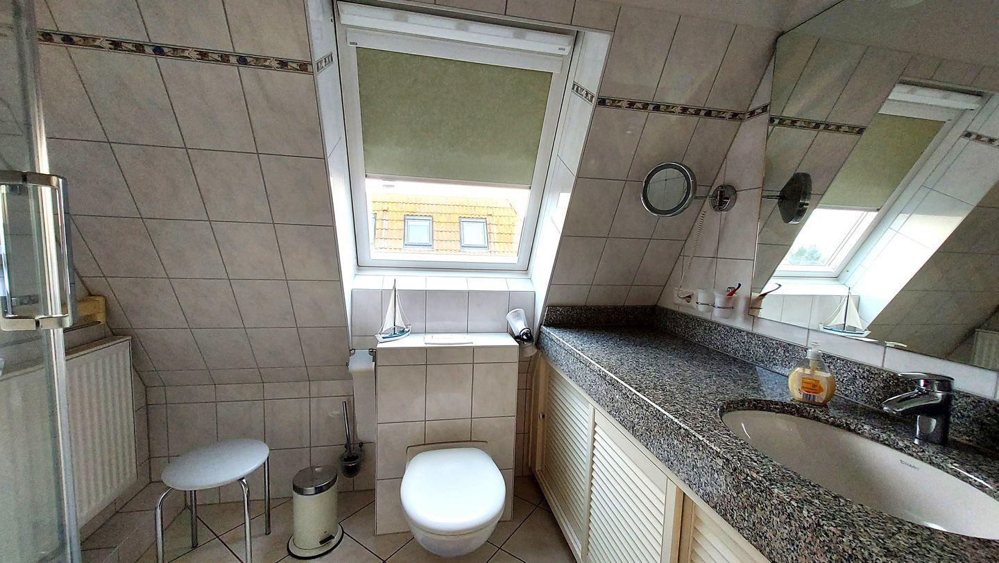Im Bad gibt es eine Dusche, WC, Waschtisch und Haartrockner. Außerdem gibt es in der Wohnung ein Gäste-WC.