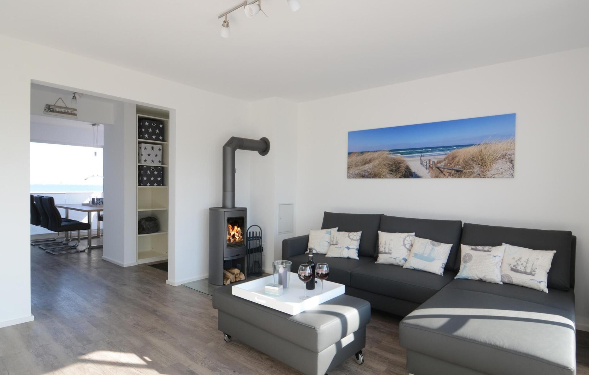 Kuschelig wird es im Wohnzimmer, denn hier lädt eine gemütliche Sitzlandschaft auch an nordischen Schietwettertagen zu einem gemütlichen Kaminabend ein.
